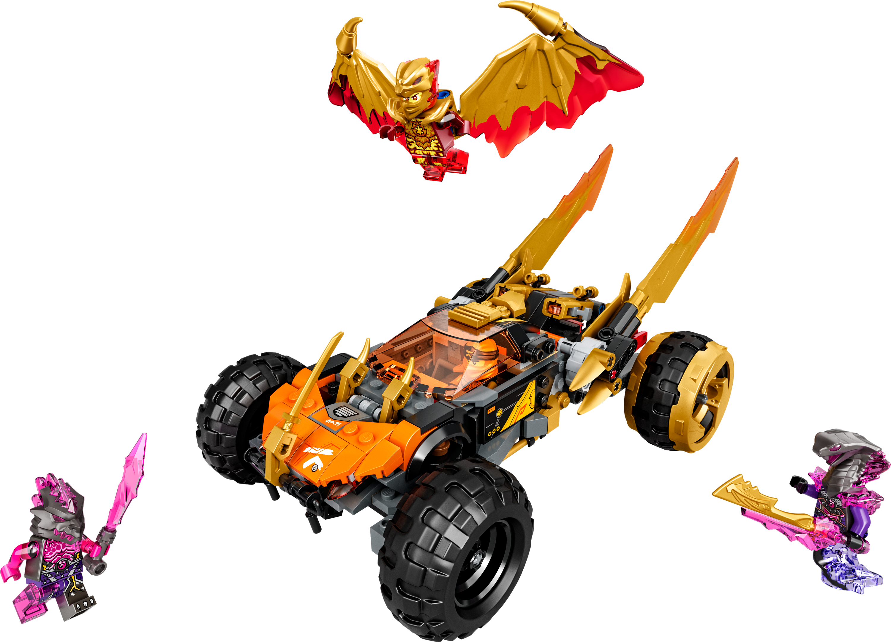 У цей набір для складання Ніндзяго входятьчотири мініфігурки: Золотий дракон Кай з його стихійною зброєю і золотими крилами дракона, прикрашеними шипами, золотий Коул, зміїний генерал Асфіра, озброєний кристалічною зброєю, і Чудовисько каменю помсти з мечем.