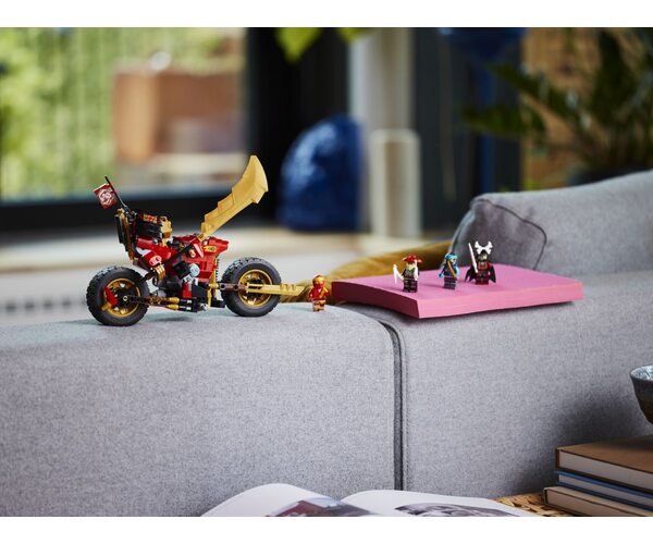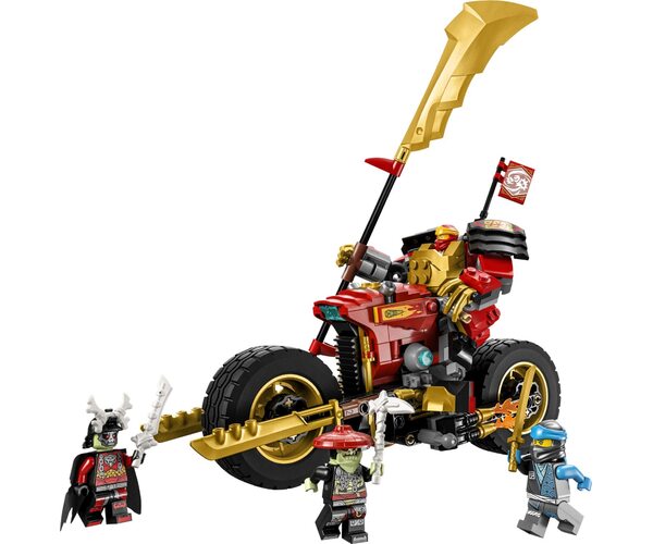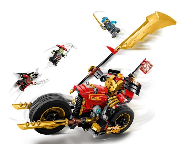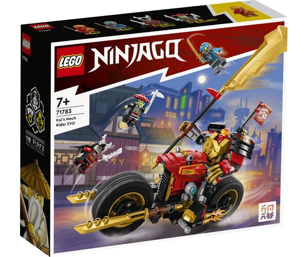 Маленькі будівельники і шанувальники крутих транспортних засобів можуть влаштувати власні фантастичні поєдинки добра й зла з допомогою конструктору LEGO NINJAGO Робот-вершник Кая EVO. Він містить фігурку меча й крутий мотоцикл, який можна перетворити на більшу модель, додавши золоті бічні панелі й великий золоте лезо. Цей конструктор містить чотири мініфігурки: Кай і Нія, обидва озброєні мечами; король-скелет, з власним мечем; мисливець-скелет, з кістяною мотикою і мечем. Успішно виконавши завдання, дітей нагороджують колекційним прапором «Фокус», який можна прикріпити до мотоциклу ніндзя.