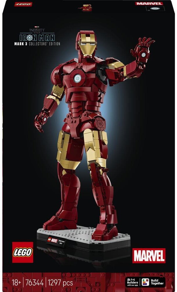 Дорослі шанувальники супергеройських пригод можуть відтворити зовнішність Залізної Людини у фільмі Marvel Studios «Месники: Сага нескінченності» за допомогою фігурки LEGO® ǀ Marvel Iron Man Mark 3 Collectors’ Edition (76344). Цей вражаючий набір, що складається з 1297 деталей, має висоту понад 38 см, що робить його чудовим подарунком на день народження або будь-який інший день для чоловіків, жінок, шанувальників Залізної Людини та любителів LEGO® віком від 18 років. Змініть деталізовану броню Залізної Людини Mark 3 у динамічні пози, змінивши положення з'єднаних шиї, талії, плечей, зап'ясть та рук.