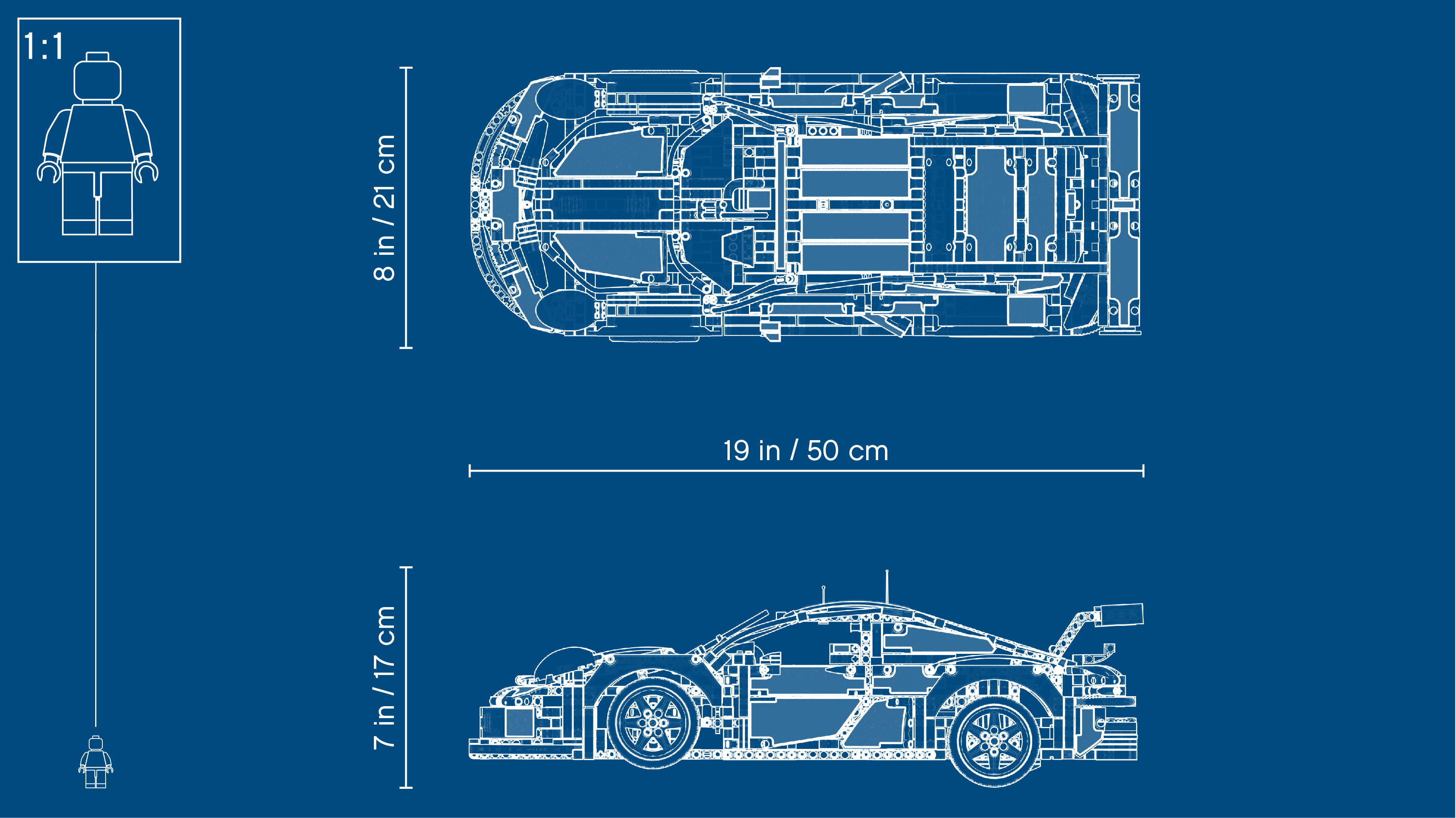 Ця дивовижна модель також має видимий диференціал, що працює, незалежну підвіску та шестициліндровий опозитний двигун з рухомими поршнями, розташований перед задньою віссю. Колеса з чорними спицями, реалістичні фари та задні ліхтарі, а також автентична біло-чорно-червона колірна гама, доповнена наклейками, вносять завершальні штрихи в образ цього неймовірного суперкара LEGO!