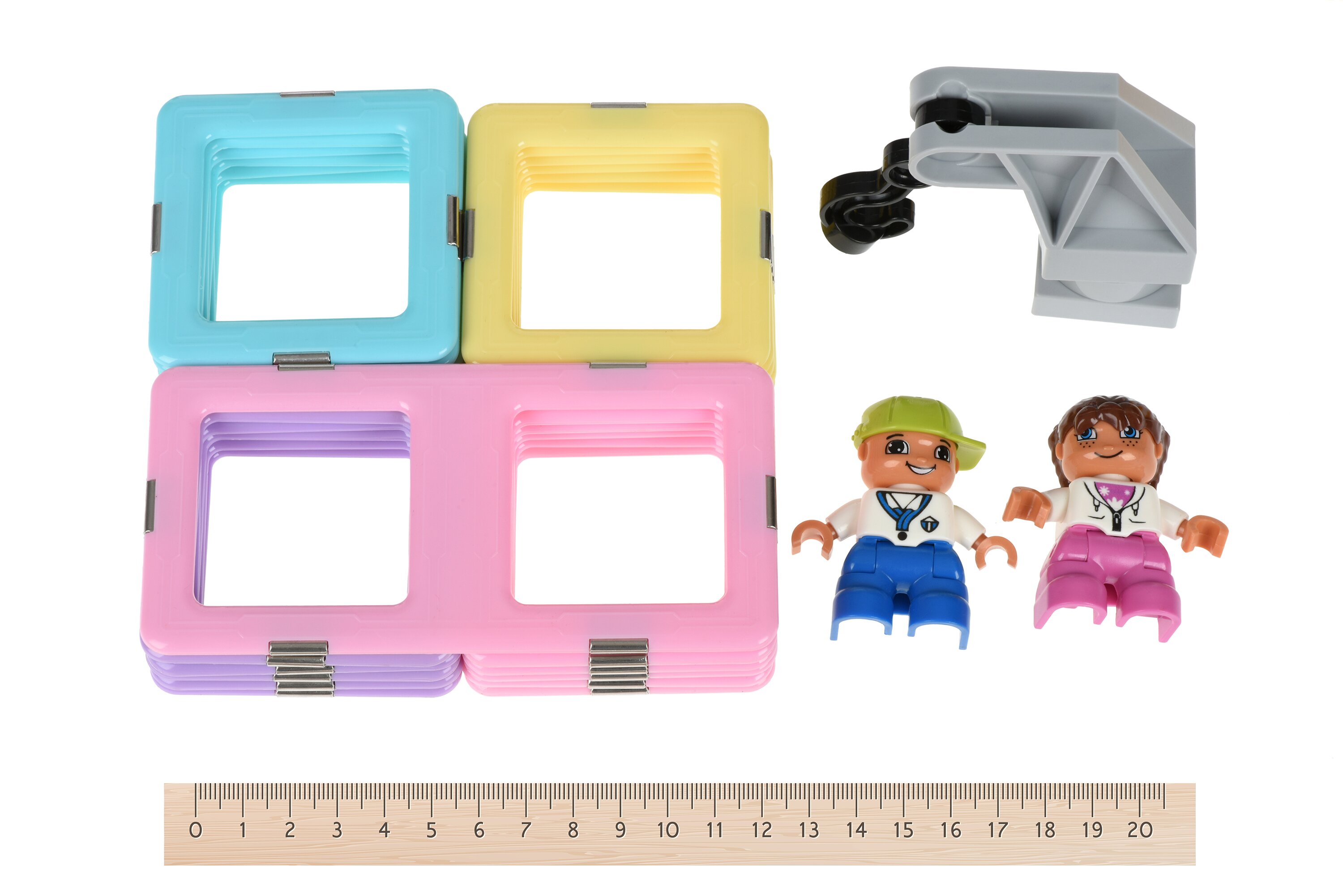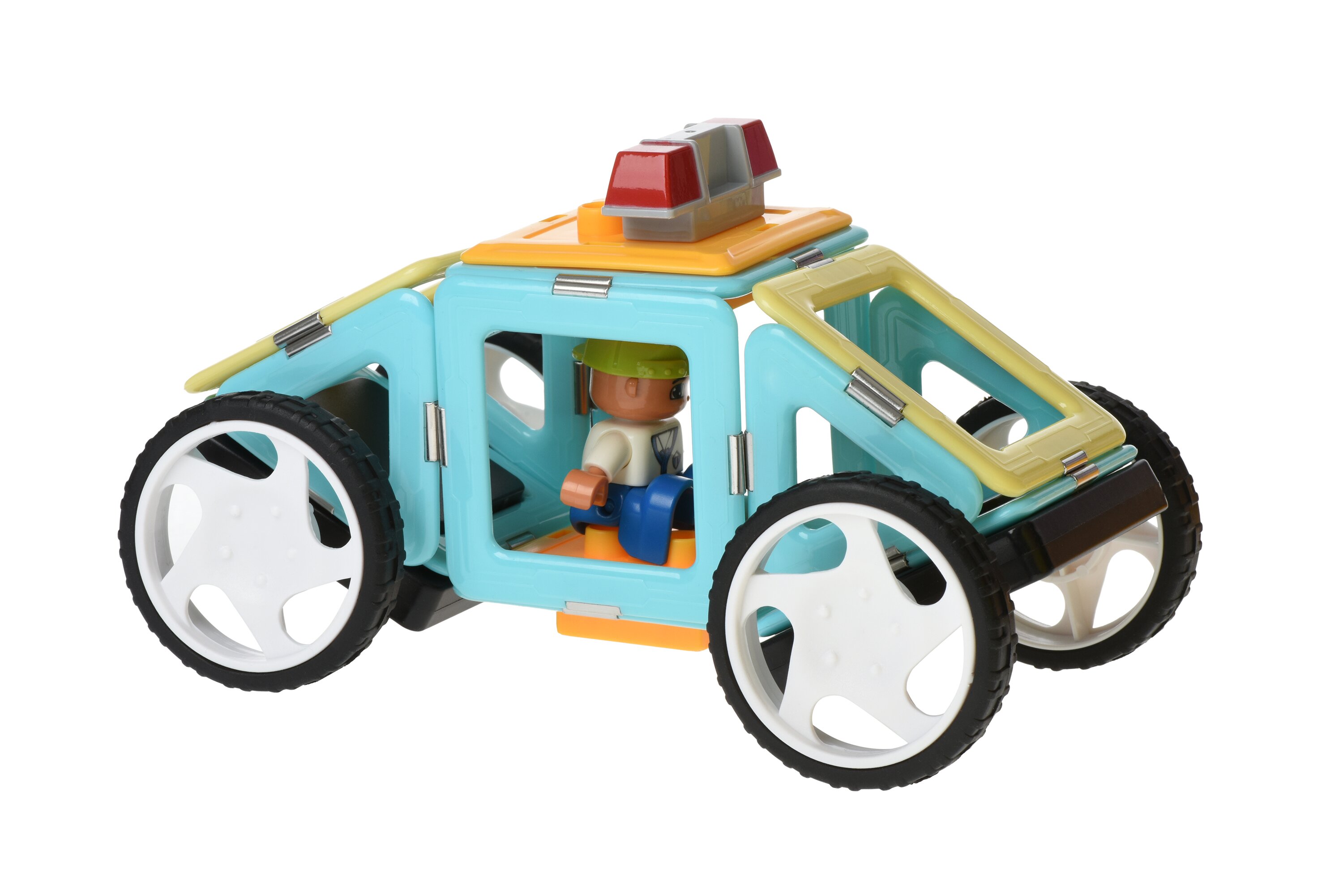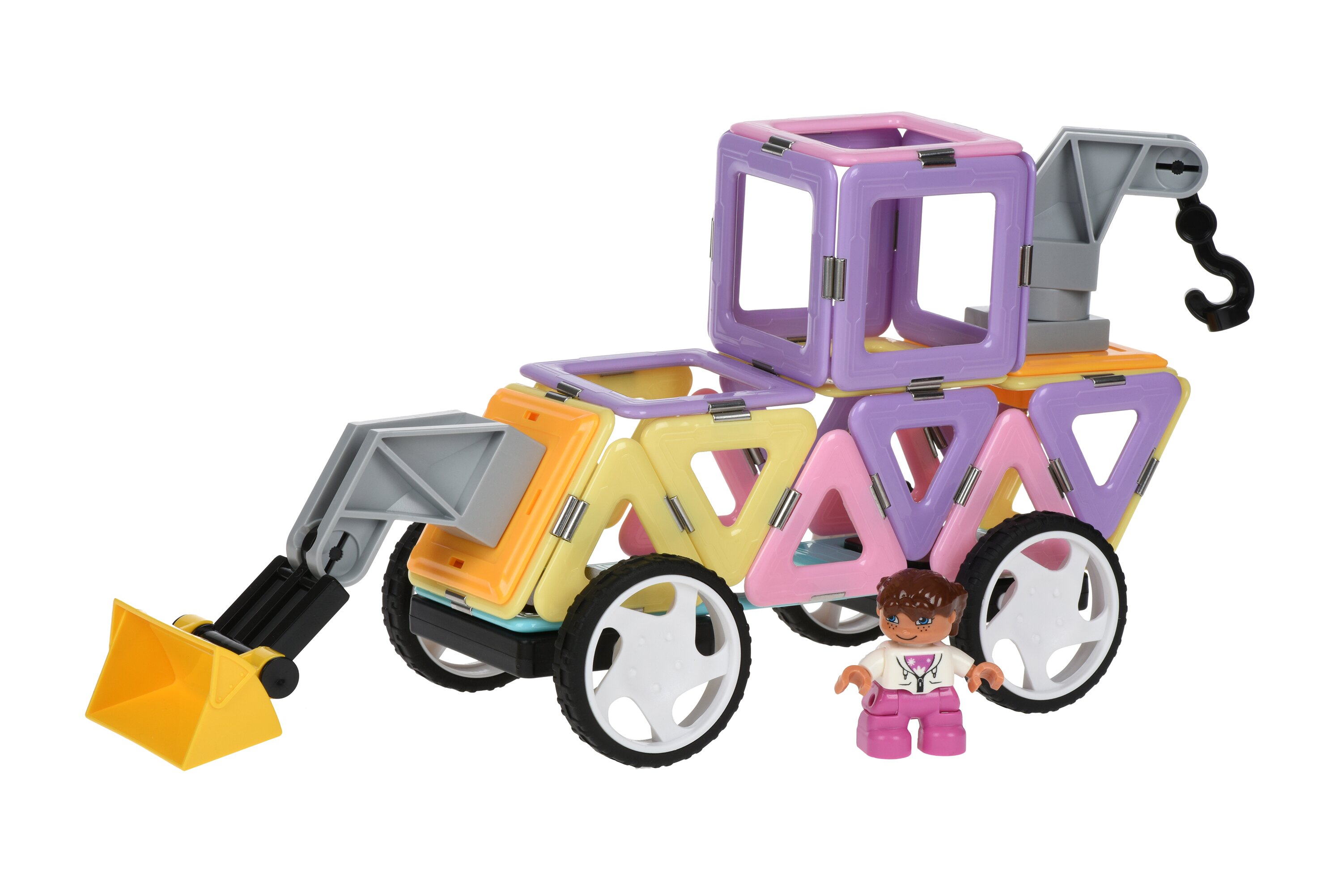У наборі 68 деталей, в які входять трикутники, квадрати, прямокутники, півкола з магнітами, а також основи з колесами, деталі для трактора, підйомного крана і екскаватора і 2 водія.