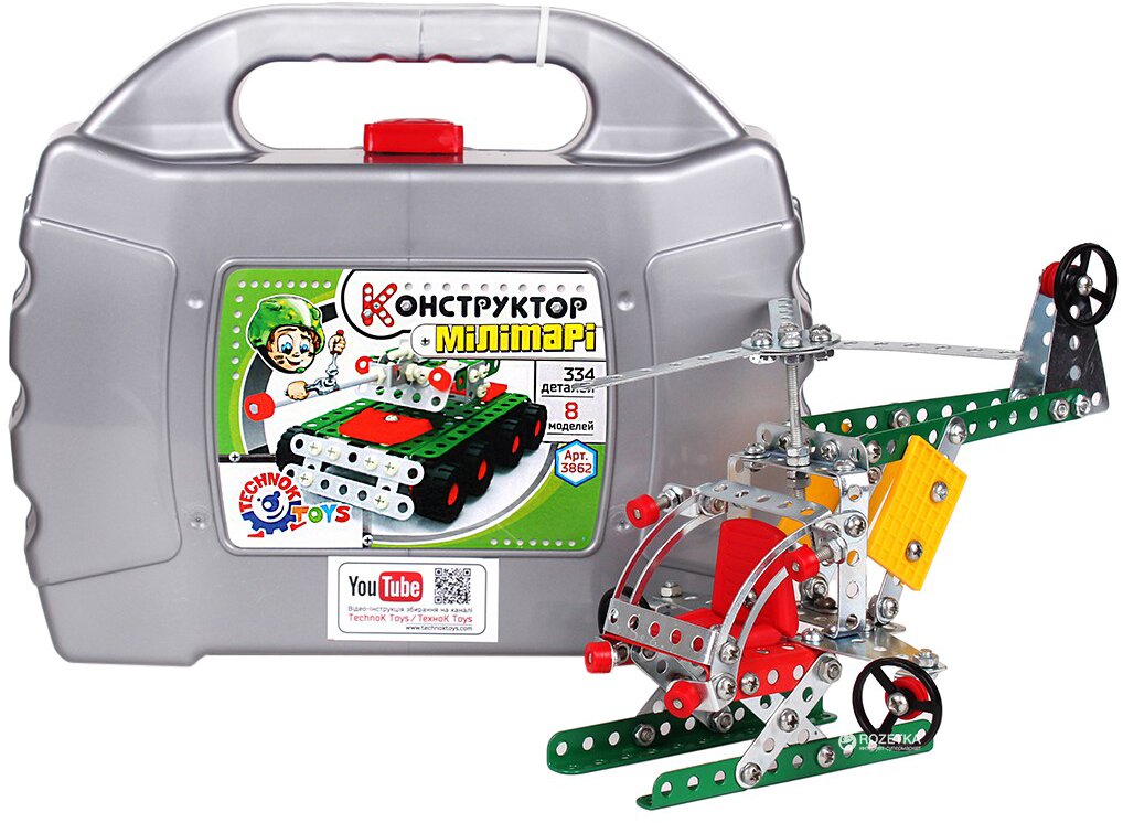 Конструктор Мілітарі — металевий конструктор нового покоління. Особливість іграшки — відеоролики з інструкціями для збирання моделей. На упаковці конструктора розміщений QR-код і адреса каналу TechnoKToys на сервісі відеохостингу YouTube. Наприклад, Ви починаєте збирати модель "Танк" із набору. Зазвичай можна скористатися кольоровою інструкцією з комплекту, проте більш наочним і цікавим буде перегляд відеоряду покрокового збирання іграшки від початку до кінця, маючи можливість зупинити відтворення в будь-який момент. Для цього Вам потрібно: просканувати QR-код згаданий вище та вибрати на каналі TechnoKToys відеосервісу YouTube ролик до відповідної моделі 3862. Тут ви також можете переглянути цікавий сюжетний промо-ролик за участю моделей із цього конструктора.