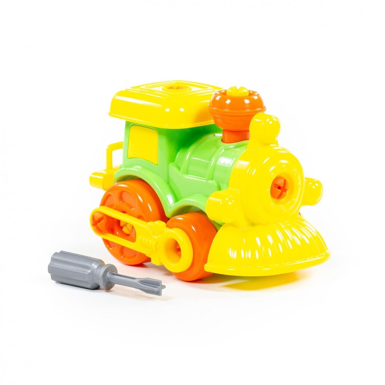 Іграшка виготовлена в яскравих кольорах, з якісного матеріалу, має округлу форму. Усі елементи паровозика представлені як конструктор, який з'єднується з допомогою пластмасових шурупів. До набору також входить хрещата викрутка, з можливістю відкручувати гайки, яка урізноманітнює гру, зробить її ще цікавішою, даючи змогу без зусиль розбирати та збирати паровозик.