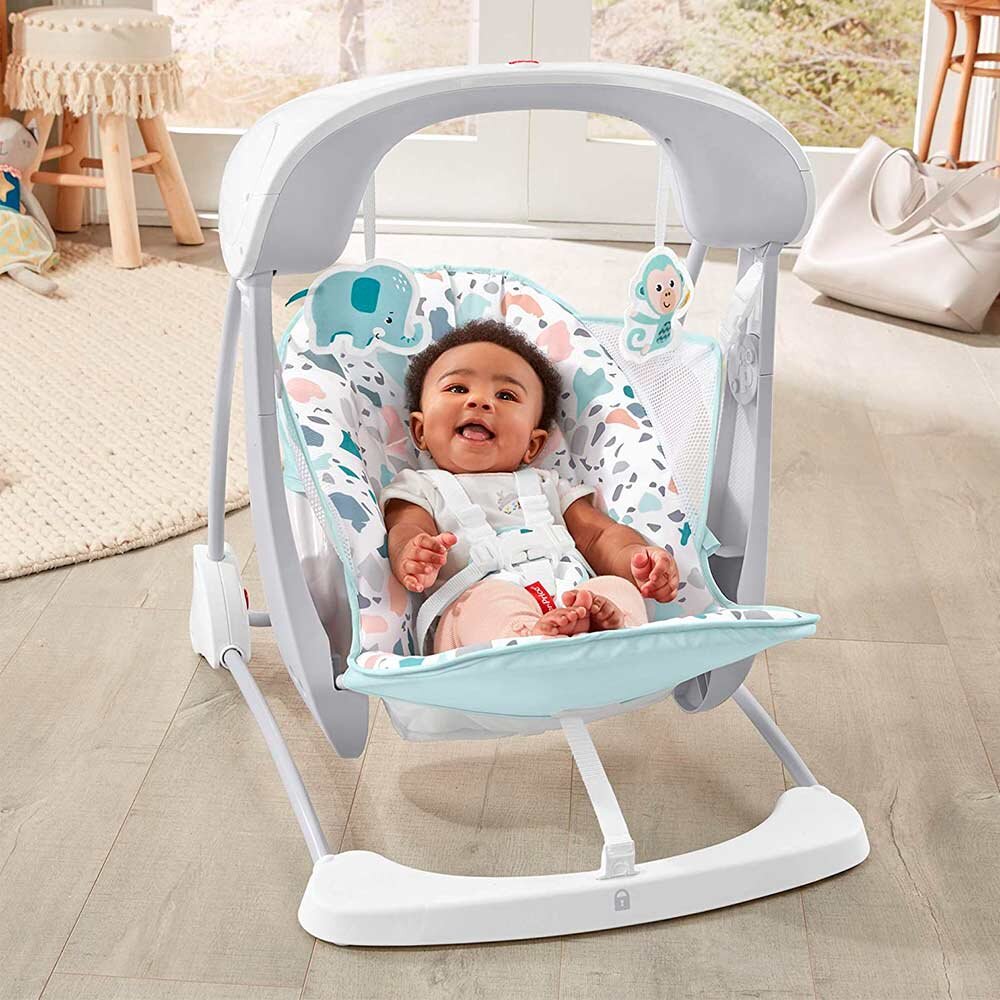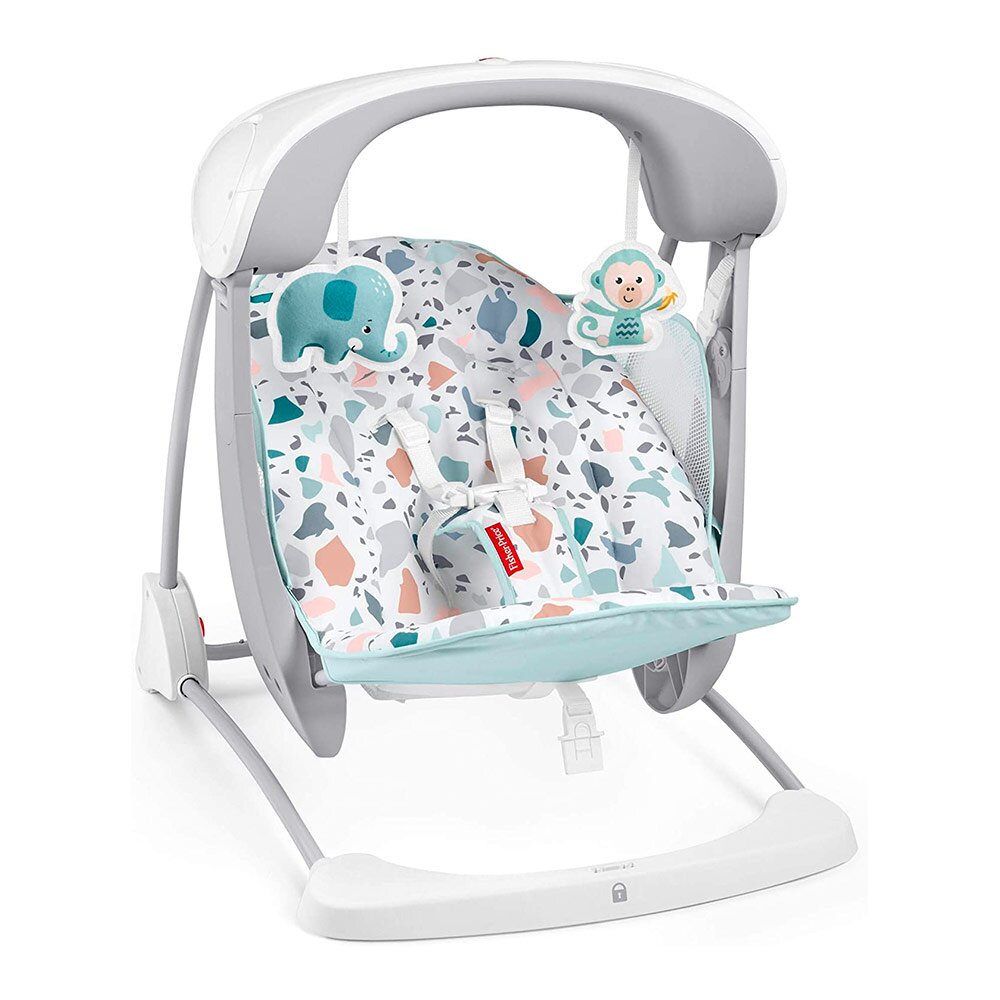 Крісло-гойдалка Fisher-Price Веселе катання допоможе заспокоїти малюка та надасть кілька вільних хвилин батькам. Модель стійка та легко складається для зручного зберігання. М'яке сидіння в режимі розумного гойдання приємно похитеється та вібрує з різною швидкістю, аби заспокоїти дитину. Гойдалка кріпиться до основи і таким чином перетворюється на стаціонарне крісло. П'ятиточкові ремені безпеки зроблять катання безпечним. Веселий слоник, грайлива мавпочка та 10 легких мелодій розважать немовля.