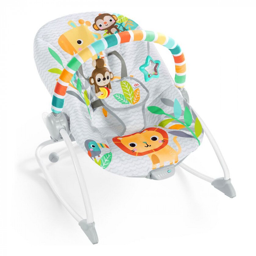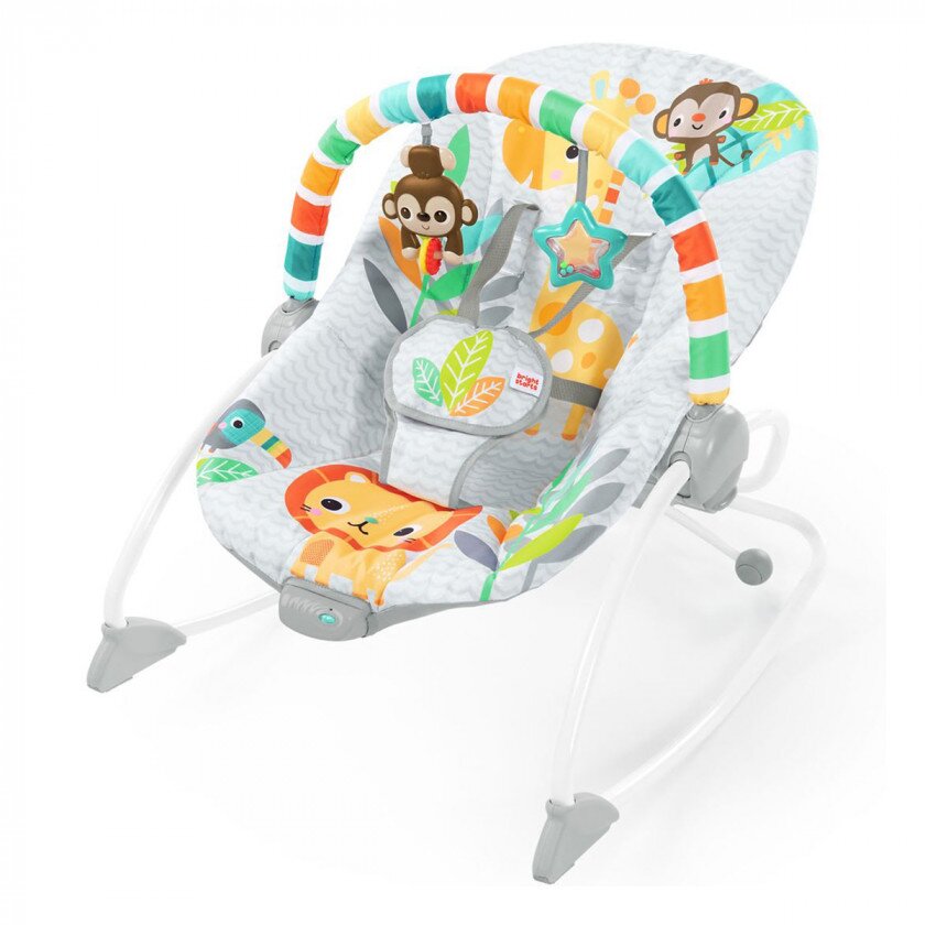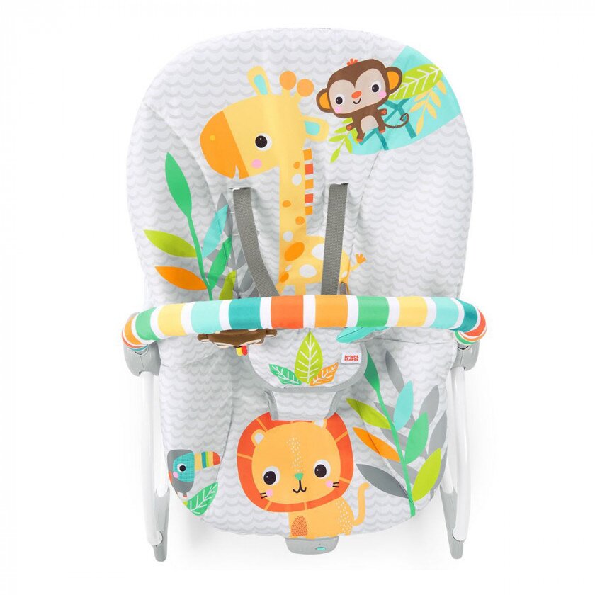 Крісло-шезлонг Bright Starts Safari Blast з функцією вібрації спеціально розроблено для дітей від народження і до досягнення ними ваги в 18 кг. Антиковзаючі ніжки і глибоке сидіння дозволяють батькам організувати для своєї дитини безпечну зону для ігор і відпочинку. Незначна вага конструкції дозволяє брати її з собою в подорож.