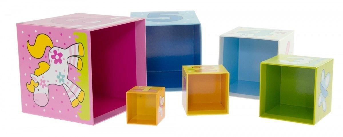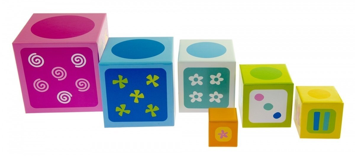 Всього в комплекті 6 кольорових кубика, а загальна висота вежі може досягати 57 см. Грані кубиків прикрашені різноманітними малюнками: цифрами, візерунками, тваринами. Така гра допоможе дитині вчитися рахувати, вивчати різновиди тварин, відчувати баланс і бути акуратним.