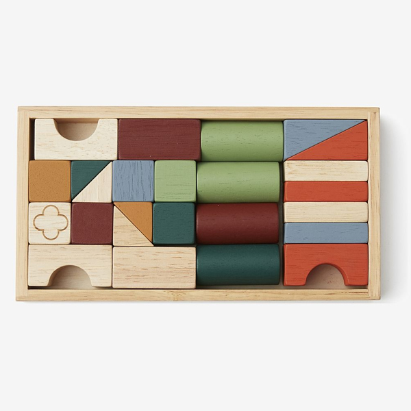 У наборі 25 кубиків різних кольорів та форм. Іграшка постачається у дерев'яній коробці.