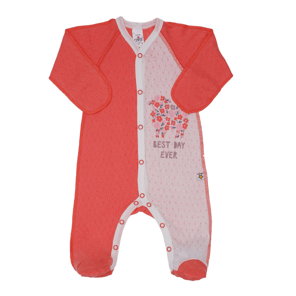 Завдяки рукаву-реглану комбінезон має хорошу посадку по плечах дитини. Пошитий швами назовні, щоб шви не натирали м'яку шкіру новонародженої дитини. Модель повнорозмірна, виконана з закритими стопами та рукавами. Застібається на кнопки. Прикрашена цікавим принтом.