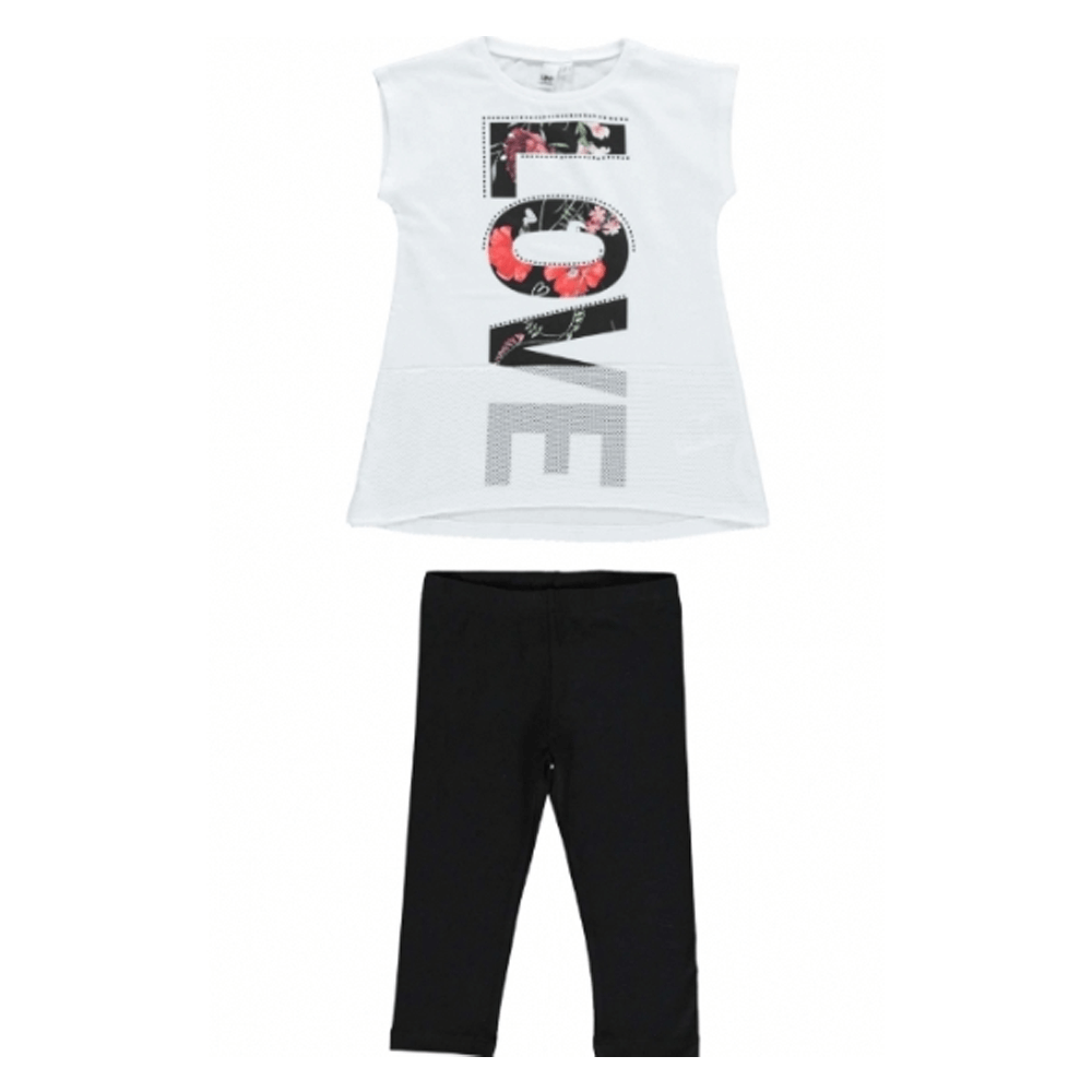 Легкий трикотажний костюм від IDO складається з двох деталей: білої туніки-безрукавки і чорних легінсів. Верх декорований квітчастим написом "Love", білою сіточкою по низу. Туніка має круглу горловину, трохи розширена до низу. Легінси з поясом на талії з внутрішньої гумкою. Склад туніки - 100% бавовна, легінсів - 95% бавовна, 5% еластан. Дитячий одяг бренду iDO - це висока європейська якість і кращі модні тренди.