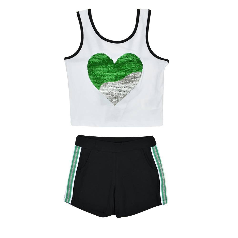 У спекотні літні дні вашій дівчинці сподобається носити цей наряд від iDO, що складається з майки та шортів. Коротка майка виготовлена з бавовняного джерсі. У неї глибокий виріз горловини, бретельки на спинці. Горловина і пройма оброблені контрастною трикотажною гумкою одного кольору з шортами. Передня частина майки прикрашена "серцем" з оборотних блискіток. Шорти з кишенями виготовлені з еластичного трикотажу. Мають м'який еластичний пояс на талії з внутрішньої стрічкою. По боках декоровані блискучими смугами, які відображають кольори "серця" майки!