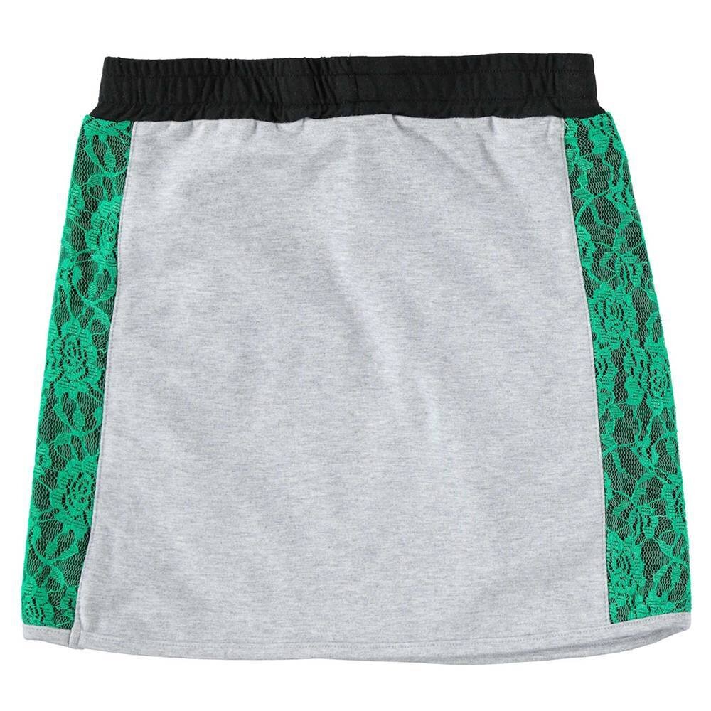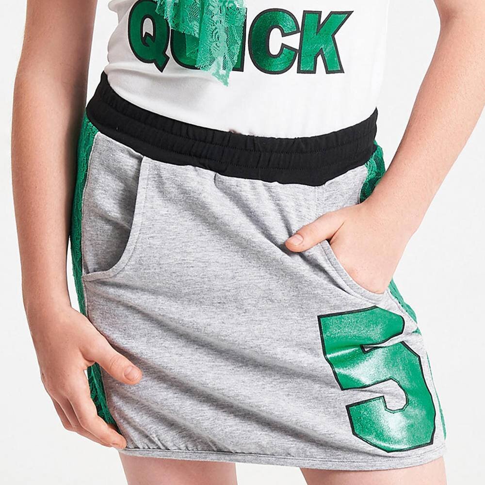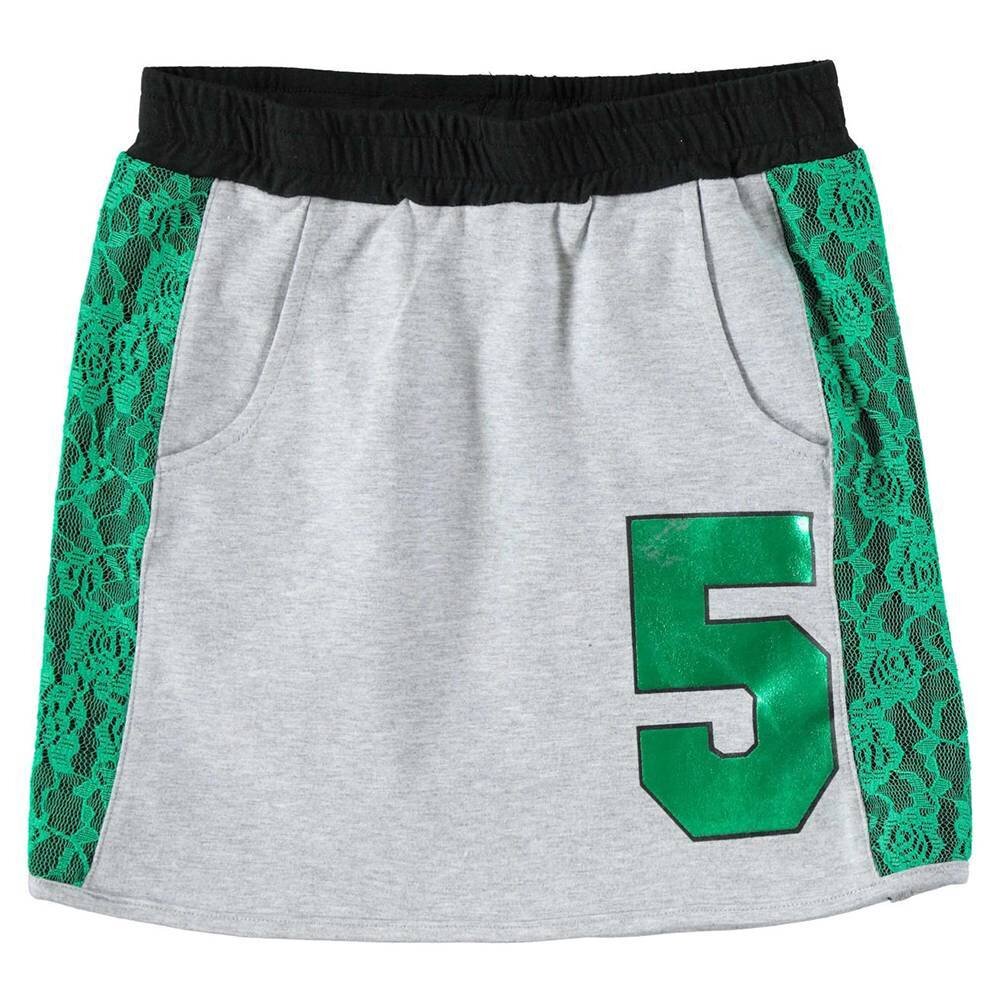 Модна сіра спідниця в стилі спорт-шик - відмінний варіант для повсякденних літніх луків! Пошита з еластичного трикотажу. Трохи розширена до низу. Добре підкреслює талію завдяки чорному поясу-гумці. Має врізні кишені. Прикрашена чорними вставками та зеленим мереживом по боках, принтованою "5" з напиленням. Довжина - до коліна. Дитячий одяг бренду iDO - це висока європейська якість і кращі модні тренди!