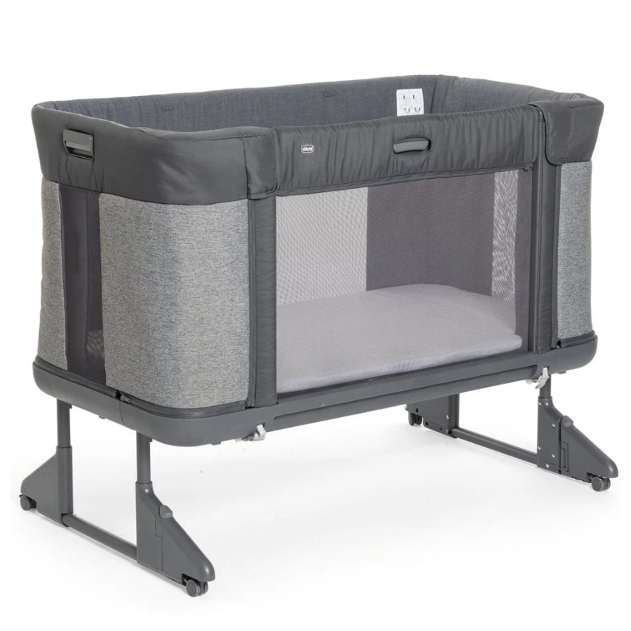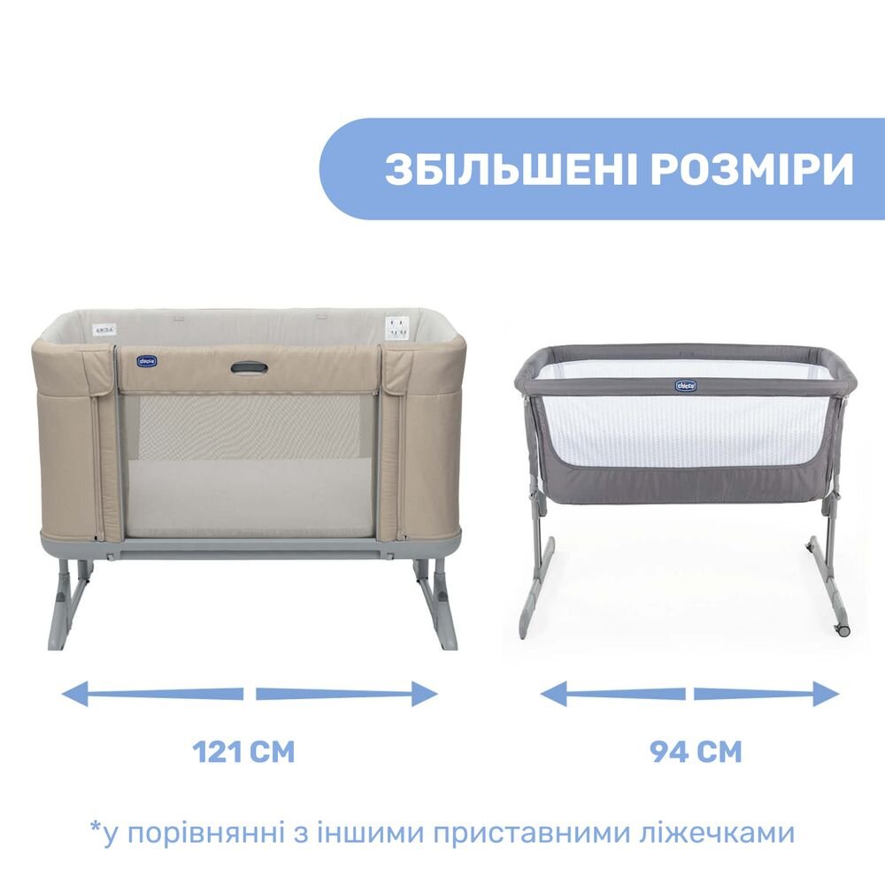 Приставне ліжечко з великим спальним місцем і опускною боковиною, яку легко відкривати та закривати однією рукою. Обладнане бічним огородженням із запатентованою системою безпеки, яка запобігає його опусканню, коли ліжечко не повністю прикріплене до ліжка батьків.
