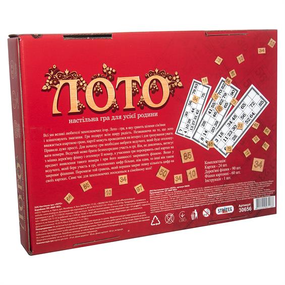 Гра лото з дерев'яними фішками Strateg (30656) розвиває пам'ять та уважність. Замість звичних барил, у цьому лото використовуються дерев'яні фішки з нанесеними номерами.