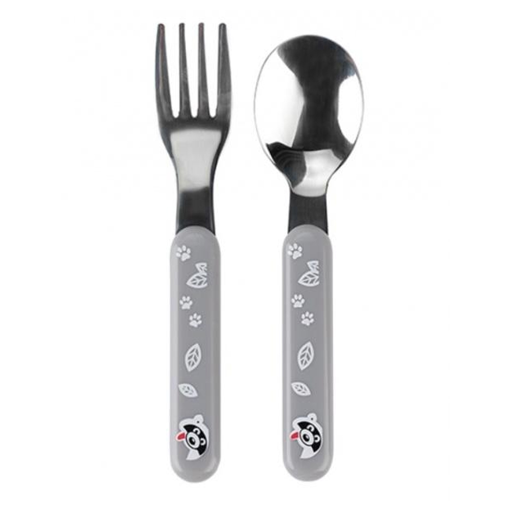 Ложка та виделка з нержавіючої сталі із закругленими кінцями та пластиковою ручкою з малюнками.