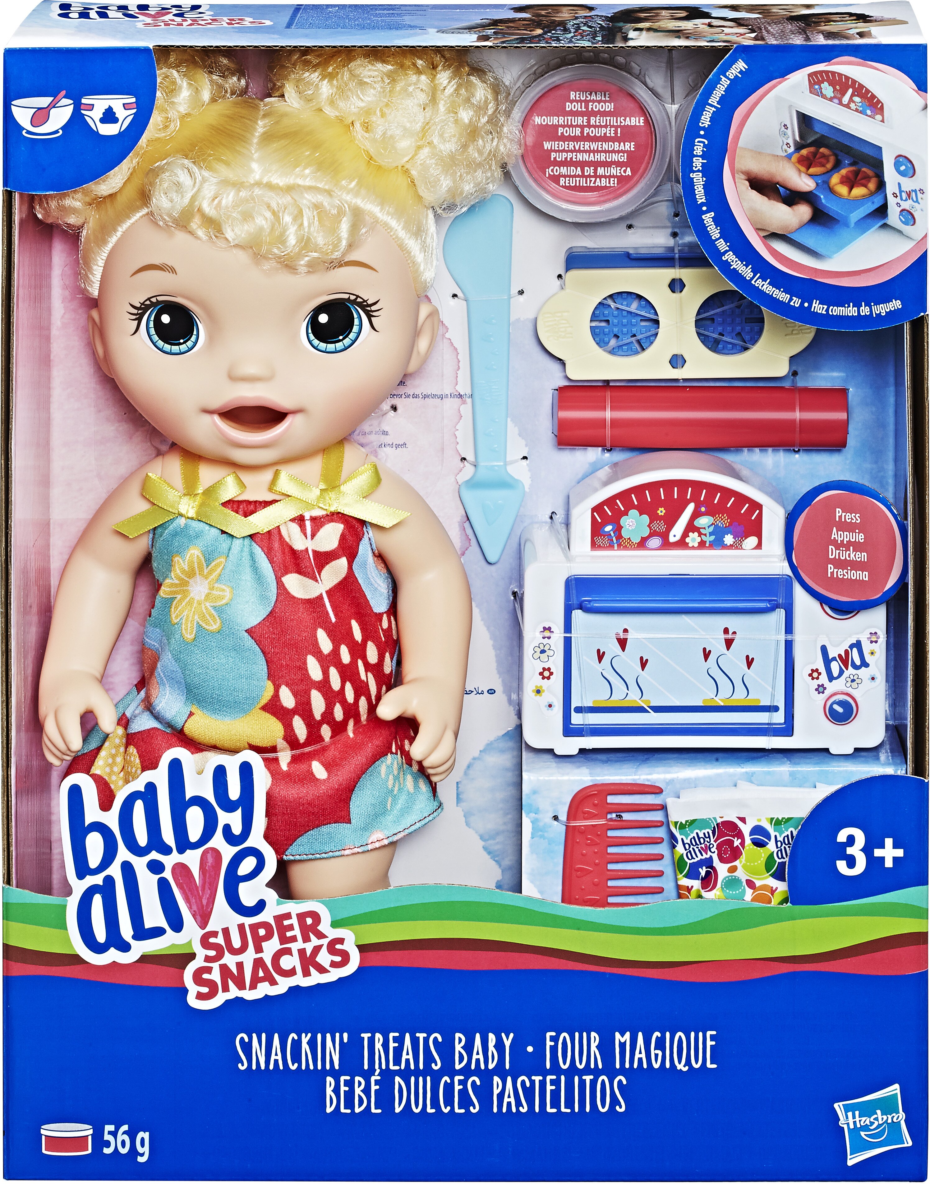 У наборі: лялька, вбрання, духовка, таця для їди, мірна ложечка, гребінець, 2 баночки з масою для ліплення, підгузок.