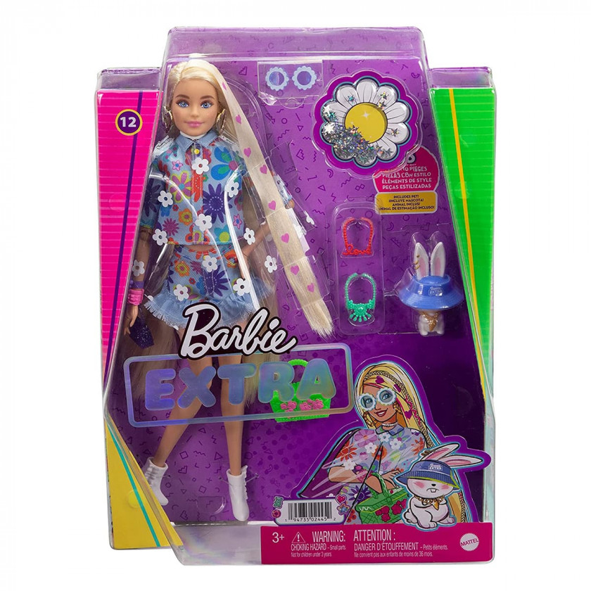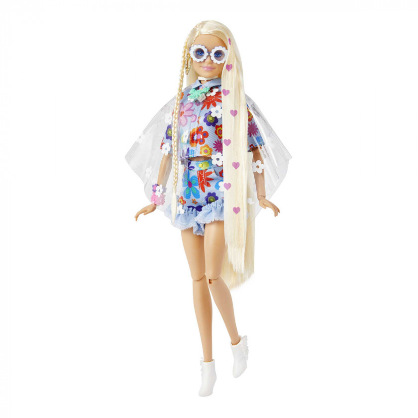 Особливості: Барбі Екстра слідує принципу «чим більше модних деталей, тим краще». У ляльки Барбі довге світле волосся, прикрашене прийнятим у вигляді сердець. Лялька представлена в яскравому топі з квітковим принтом, джинсових шортах з оборками в тон, напівпрозорому пончо з квітковим принтом. Серед аксесуарів у Барбі є сумка для пікніка, сонцезахисні окуляри в стилі ретро з квітами і білі ботильйони. Фігурка домашнього кролика зі знімним капелюхом, масивними золотими прикрасами та чарівним виразом мордочки. Лялька має багато точок артикуляції: ноги рухливі в стегні і колінах, руки - в плечах, ліктях, кистях.