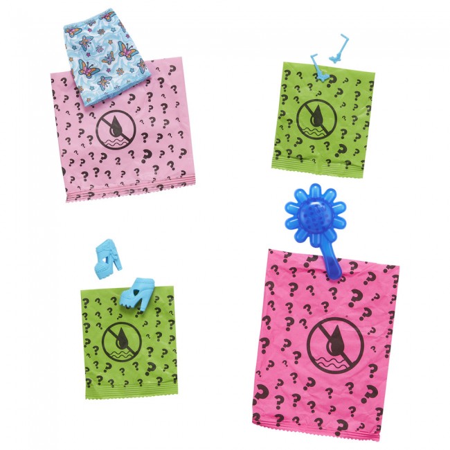 В пакетиках приховані додаткові аксесуари для ляльки. Сюди входить спідниця або шорти з кумедним малюнком, різнокольорові туфлі, великі прикольні сережки та щітка у формі квітки.