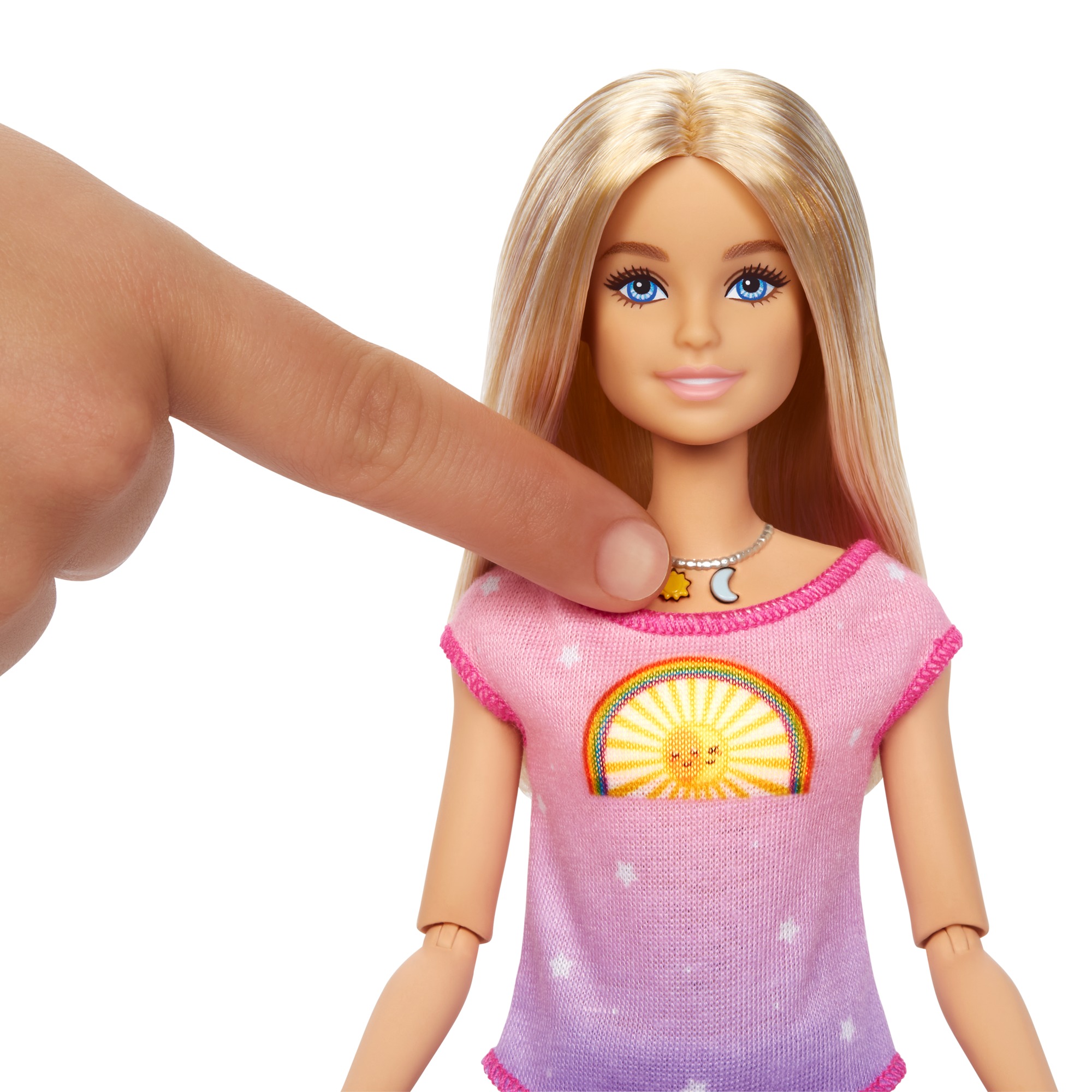 Barbie знає, що потрібно дітям аби почуватись добре та мати здоровий емоційний стан! Лялька Медитація вдень та вночі є відмінним способом розслабитися вдень та заснути вночі, практикуючи усвідомленість і медитацію в ігровому форматі. Вмикайте світло та заспокійливу музику у двох режимах: денному й нічному. Натисніть на підвіску у вигляді сонця на шиї ляльки Barbie, щоб активувати денний режим із музикою для розтяжки та дихальних вправ. Натиснувши на підвіску-місяць, ви активуєте нічний режим для розслаблення м’язів та засинання. Дитина може сама спробувати виконати ці вправи. А цуценя допоможе показати процес медитації. Потрібно просто вставити йому в голову один зі смайликів і уявити, що це хмарка з думками, які приходять під час медитації.