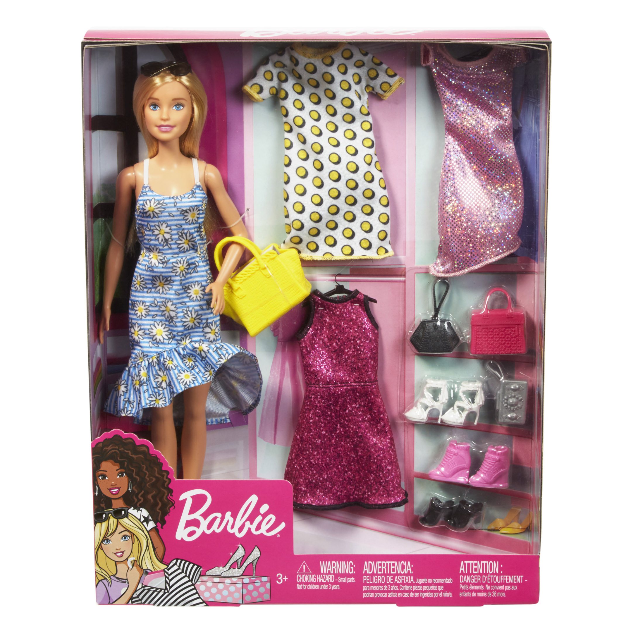 У наборі: 4 комплекти одягу; 4 пари взуття; 4 сумочки; сонцезахисні окуляри для завершення образу. Різні елементи можна поєднувати з одягом і аксесуарами з цього або інших наборів для ляльок Barbie, створюючи ще більше різноманітних образів.
