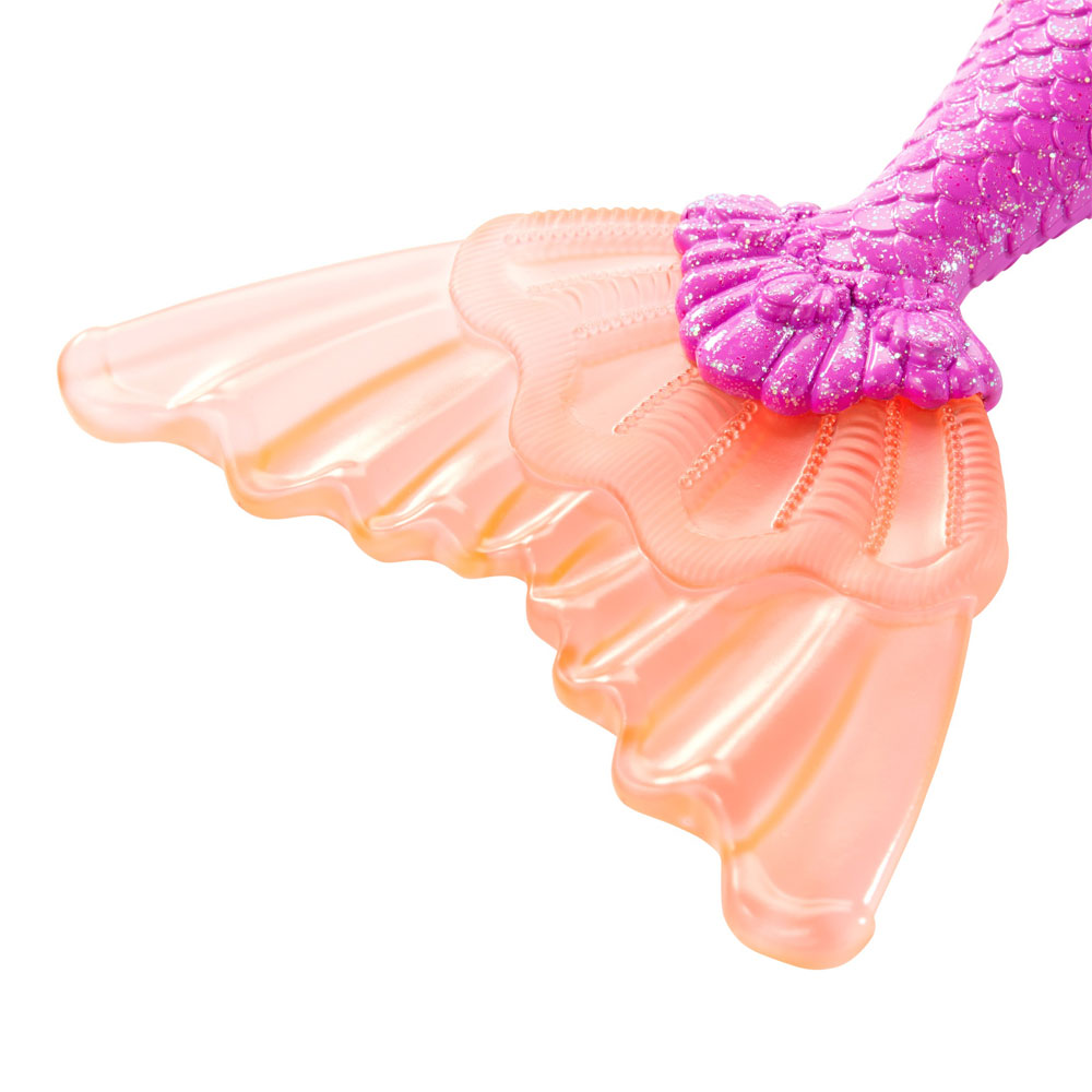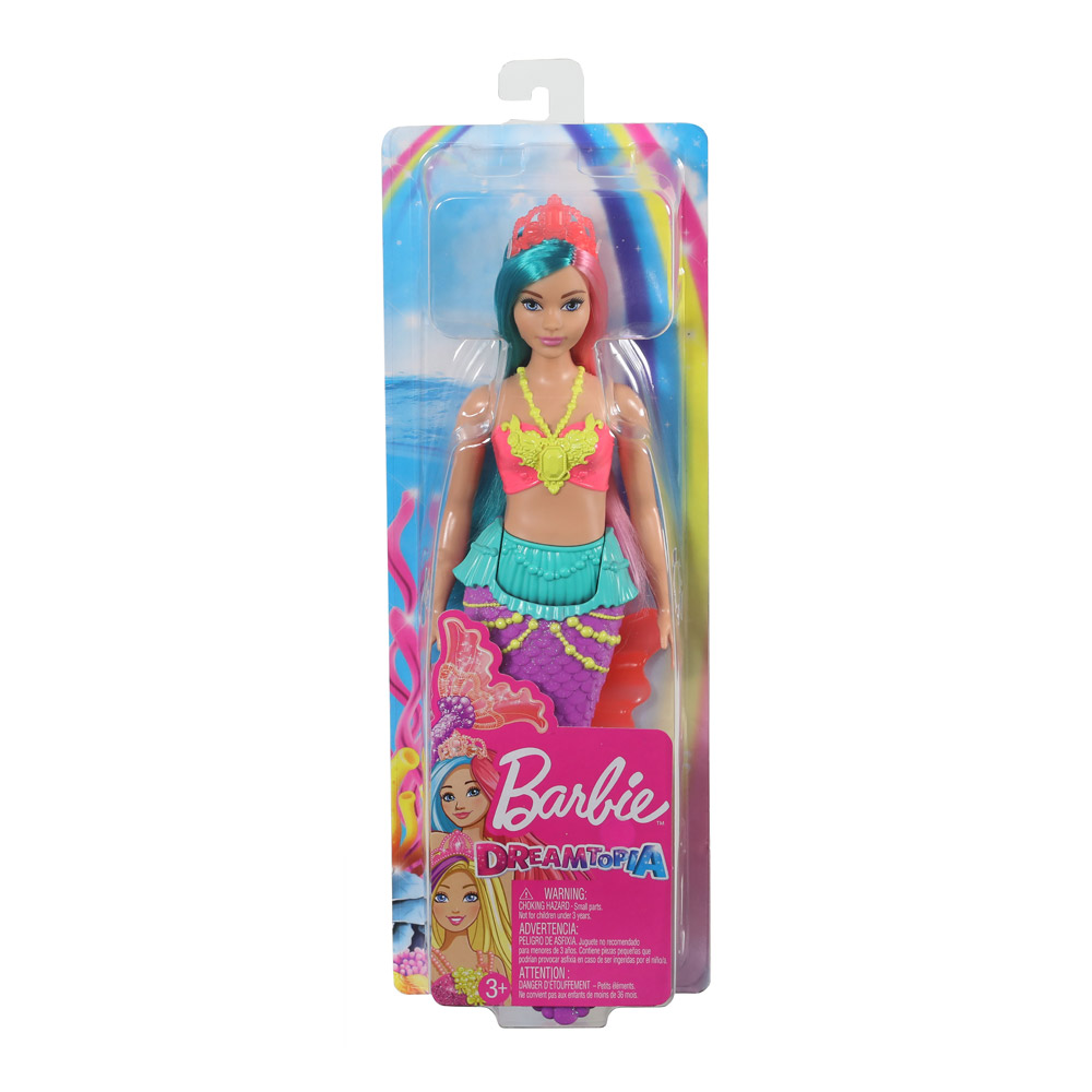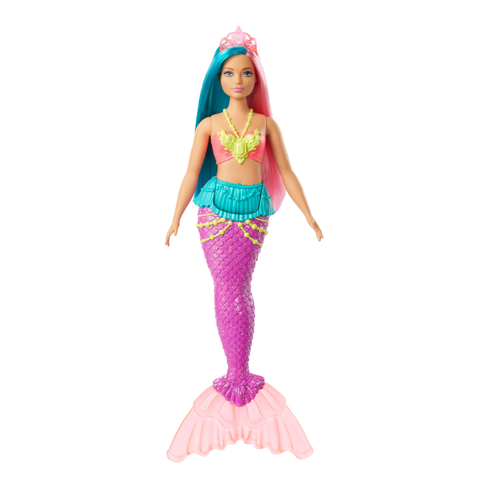Ви тільки погляньте на цю ляльку Barbie Русалку з Дрімтопіі з блакитно-рожевим волоссям! Це ж справжня морська принцеса, з якою ваша дитина вирушить у захопливу подорож на дно океану. У русалки великий хвіст, що згинається, фіолетового кольору і рожевий топ, виконаний в морській тематиці (не знімається). Яскраве волосся має два кольори — рожевий і блакитний, а голову прикрашає витончена тіара. Руки рухомі.