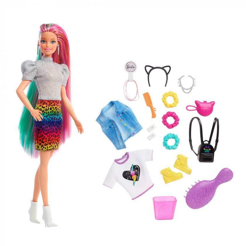 Barbie обожнює експериментувати і створювати нові образи! З Лялька Barbie Веселковий леопард 29 см діти зможуть створювати неймовірні веселкові образи з леопардовими вкрапленнями! Відкиньте волосся ляльки убік для того, щоб відкрити веселкове омбре! Зробіть гру ще цікавішою – занурте щіточку з набору в холодну воду і проведіть нею по гладко поголеній частині голови для прояву леопардових плямочок. При контакті з теплою водою вони знову зникнуть. Цю трансформацію можна повторювати безліч разів. Неймовірно!
