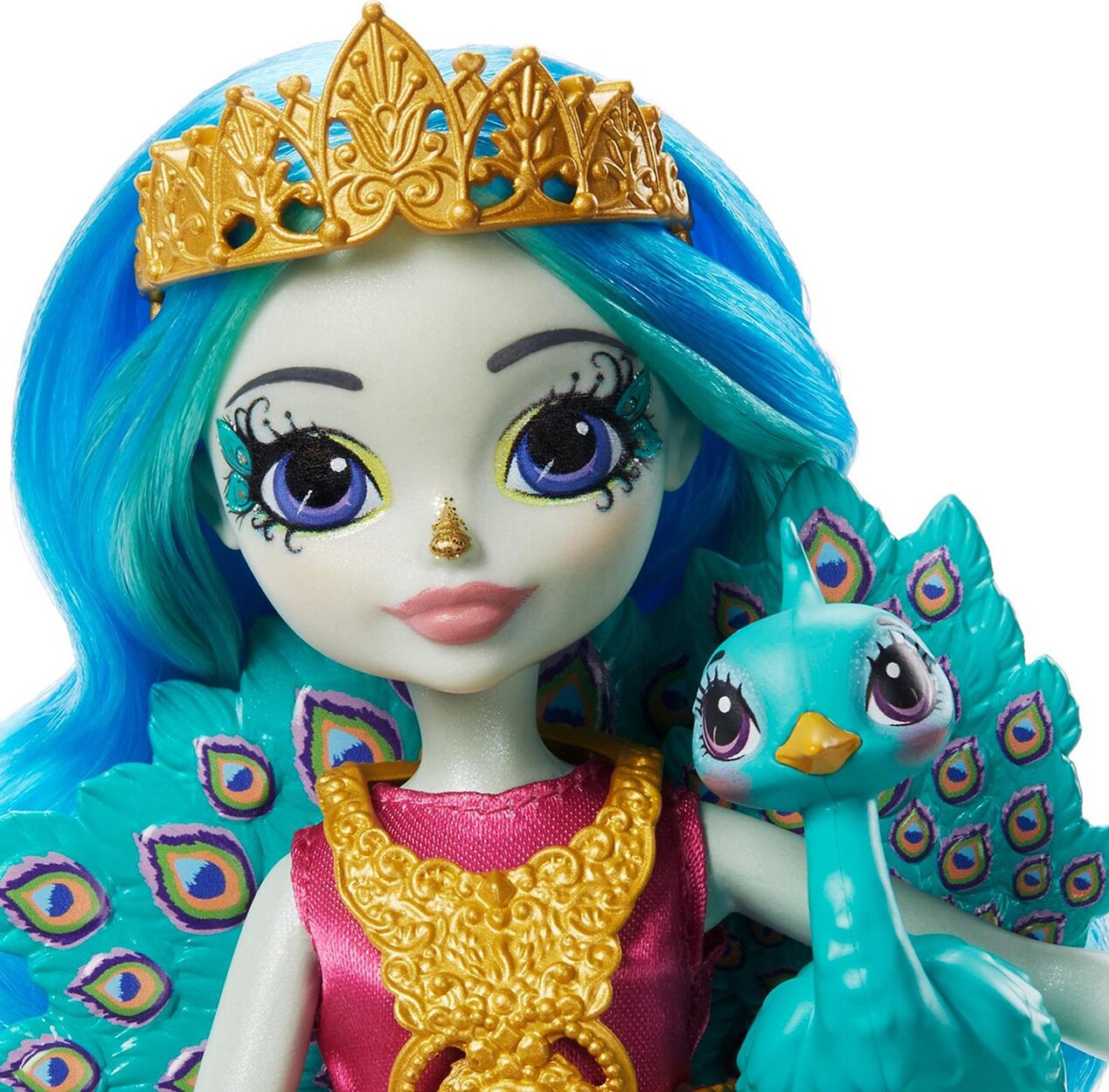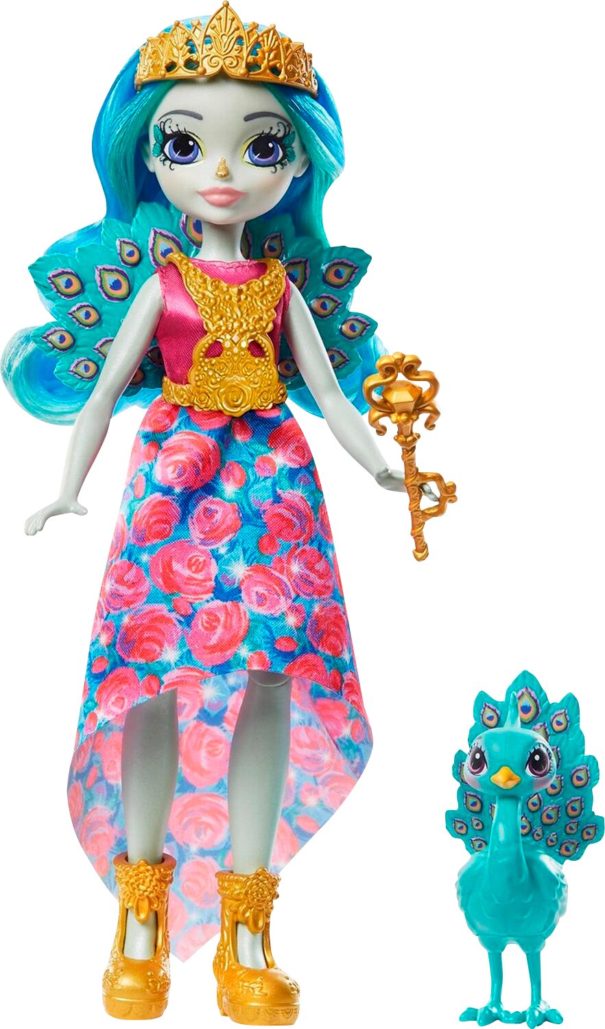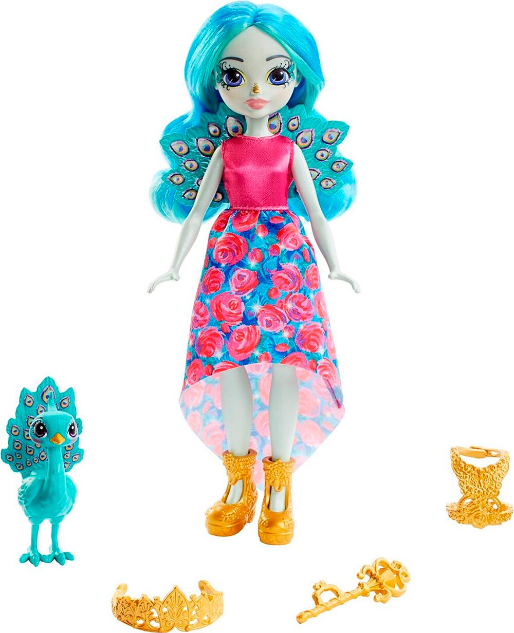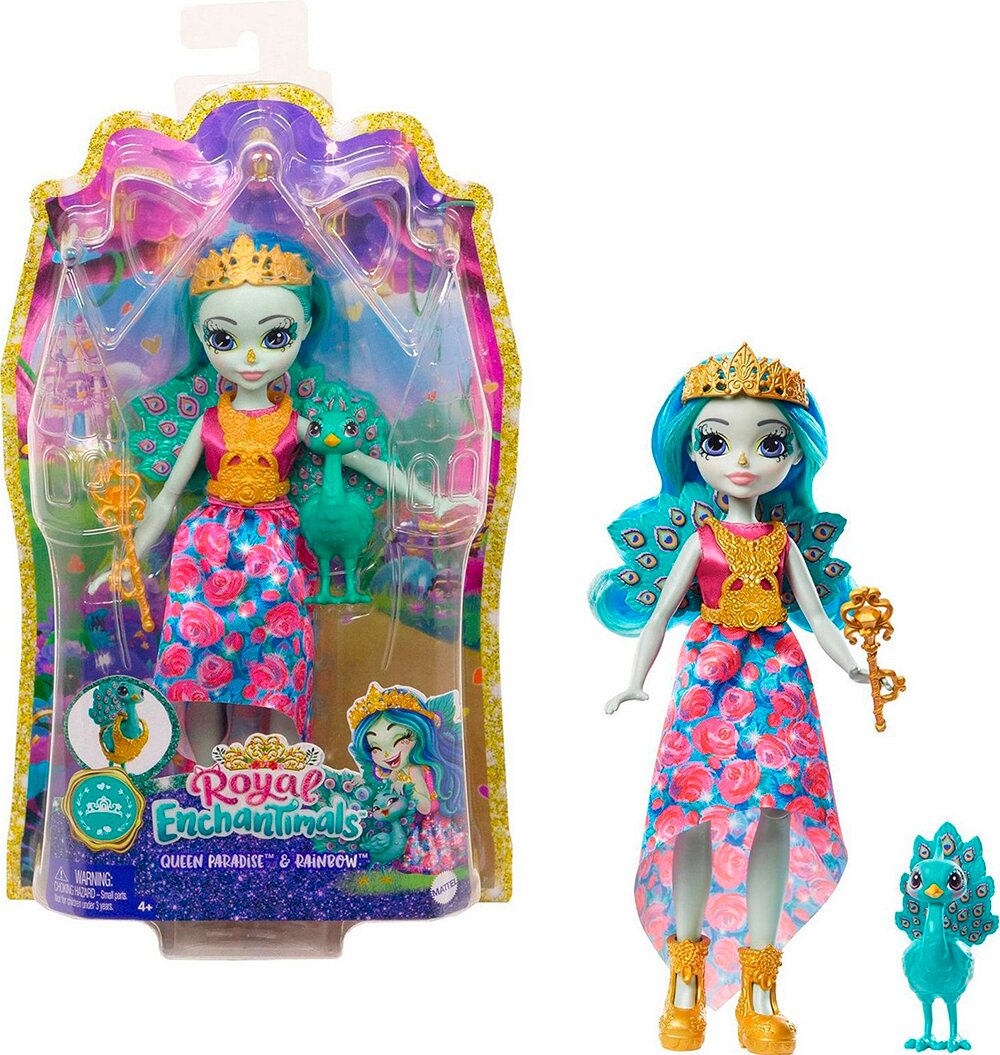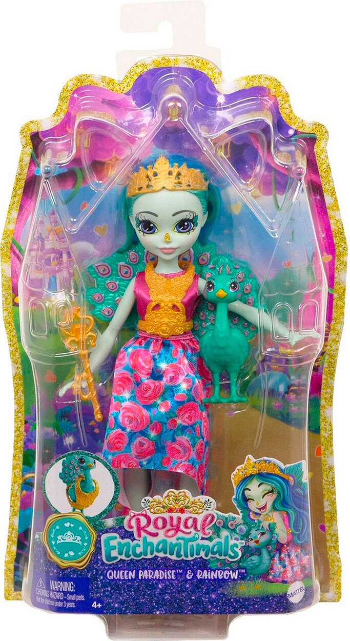 Зустрічайте Enchantimals — компанію чарівних дівчаток, що мають особливий зв'язок зі своїми найкращими друзями-звірятами. Знайомтеся з Її Величністю Павою Парадайз і її найкращою подружкою Рейнбоу. Лялька Пава Парадайз одягнена у вишукане плаття й має королівські аксесуари, як-от корона, скіпетр і намисто, яке знімається й також підходить для Рейнбоу. Лялька заввишки 20.3 см має артикуляцію в колінах. Завжди поруч із нею Пава Рейнбоу, вона готова сяяти під час будь-якої королівської події й обожнює чарівні пригоди. Так схожі між собою, Пава Парадайз і Рейнбоу надихають дитину мріяти, особливо про польоти над островом Королевичів.
