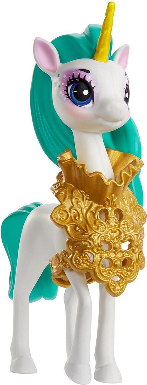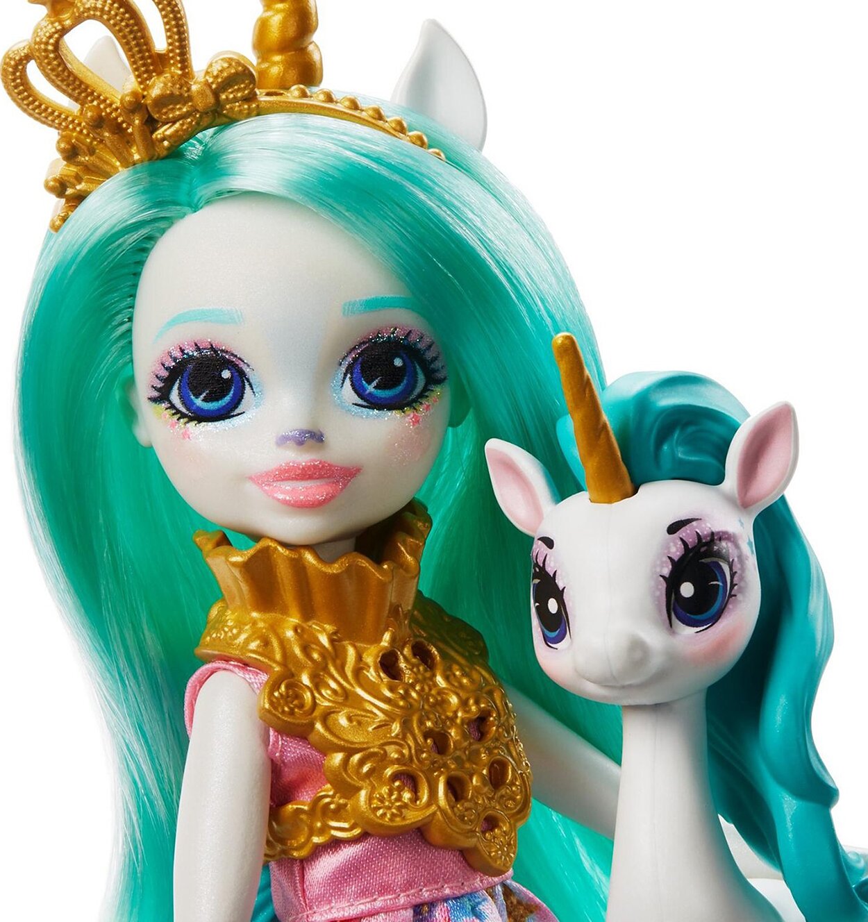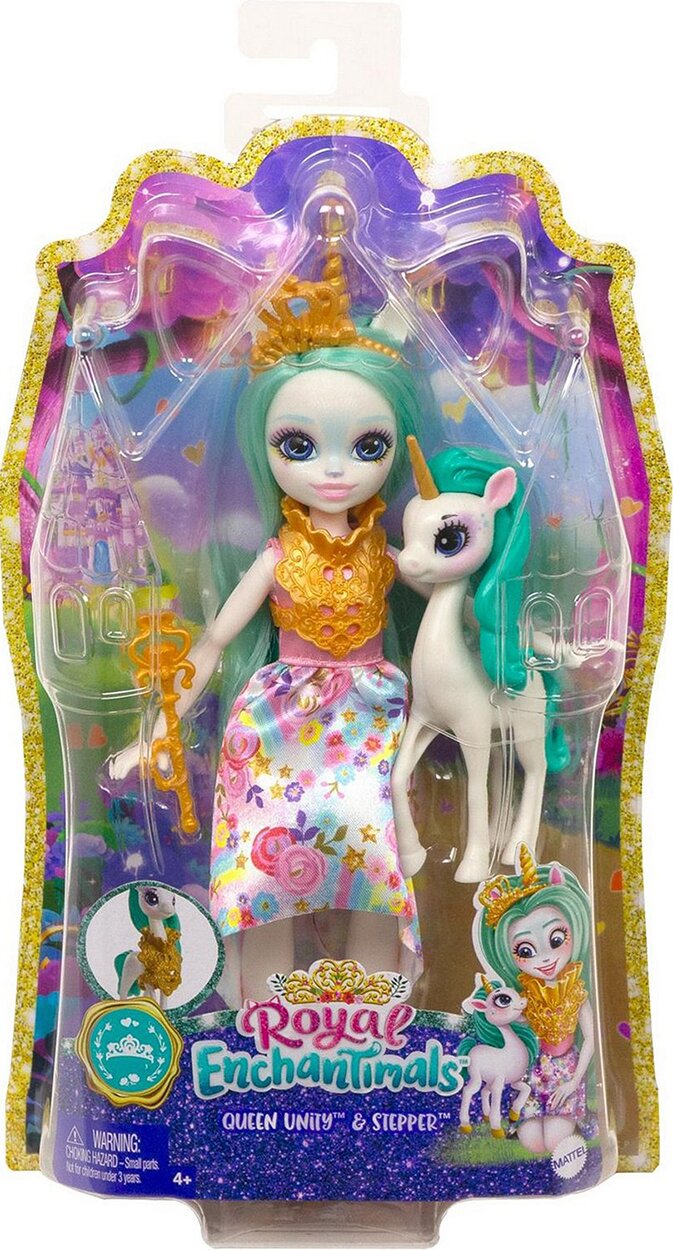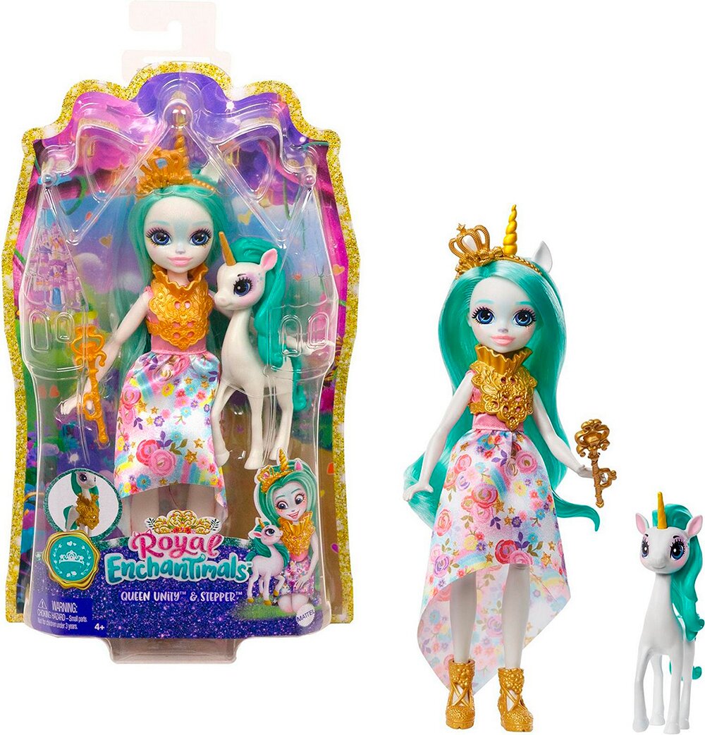 Зустрічайте Enchantimals — компанію чарівних дівчаток, що мають особливий зв'язок зі своїми найкращими друзями-звірятами. Знайомтеся з Її Величністю Єдинорогом Юніті і її найкращою подружкою Степпер.Велична лялька Єдиноріг Юніті одягнена у вишукане плаття й має королівські аксесуари, як-от корона, скіпетр і намисто, яке знімається й також підходить для Степпер. Лялька заввишки 20.3 см має артикуляцію в колінах. Завжди поруч із нею єдиноріг Степпер готова сяяти під час будь-якої королівської події й обожнює чарівні пригоди. Так схожі між собою, Єдиноріг Юніті та Степпер надихають дитину мріяти, особливо про польоти над островом Королевичів.