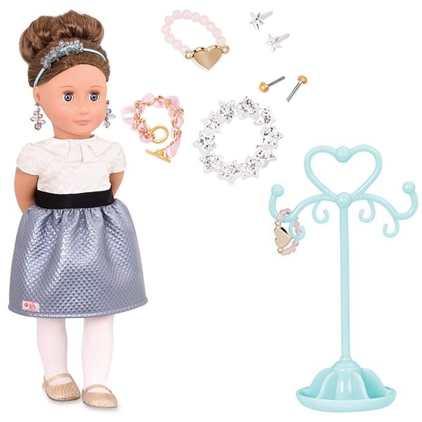 Комплектація: лялька, сукня, колготи, пара балеток, діадема, 3 пари сережок, 3 браслети, підставка під прикраси.
