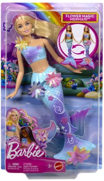 Лялька Barbie Fantastic fashion Квіткова магія Блондинка оживає в руках дитини! Варто тільки провести важіль на спинці вниз — і ніжні квіти чарівно розквітнуть від ліфа до хвоста. Цей ефект можна повторювати знову і знову, перетворюючи гру в справжнє диво. Лялька зачаровує своїм виглядом: хвіст з плавним переходом кольорів, перламутрові квіти, милий обруч з декором, схожий на перлинки, і довге світле волосся з рожевими пасмами — образ, що нагадує підводний сад мрії. Грати з русалкою буде неймовірно весело, вигадуючи пригоди як на суші, так і у воді.