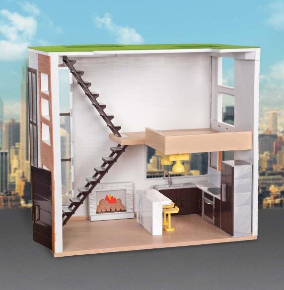 На головному поверсі є вбудований камін і чудова кухня з робочим кухонним освітленням, щоб запалити вишукану вечірку! Кухня повністю обладнана мийкою, плитою, духовкою, холодильником і рухомим кухонним островом зі штучного мармуру. Підніміться по сходах на другий поверх, і продовжуйте підйом на терасу на дах, щоб отримати кращий вигляд в місті! Повністю відкрита сторона і функціональні вхідні двері дозволяють насолоджуватися ігровими майданчиками як всередині, так і зовні. Зберіть всі стильні набори іграшок Lori, щоб оформити своє місто так, як вам хочеться.