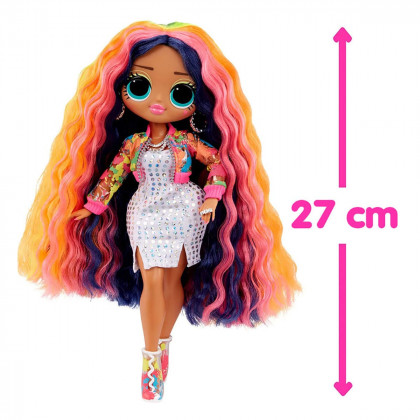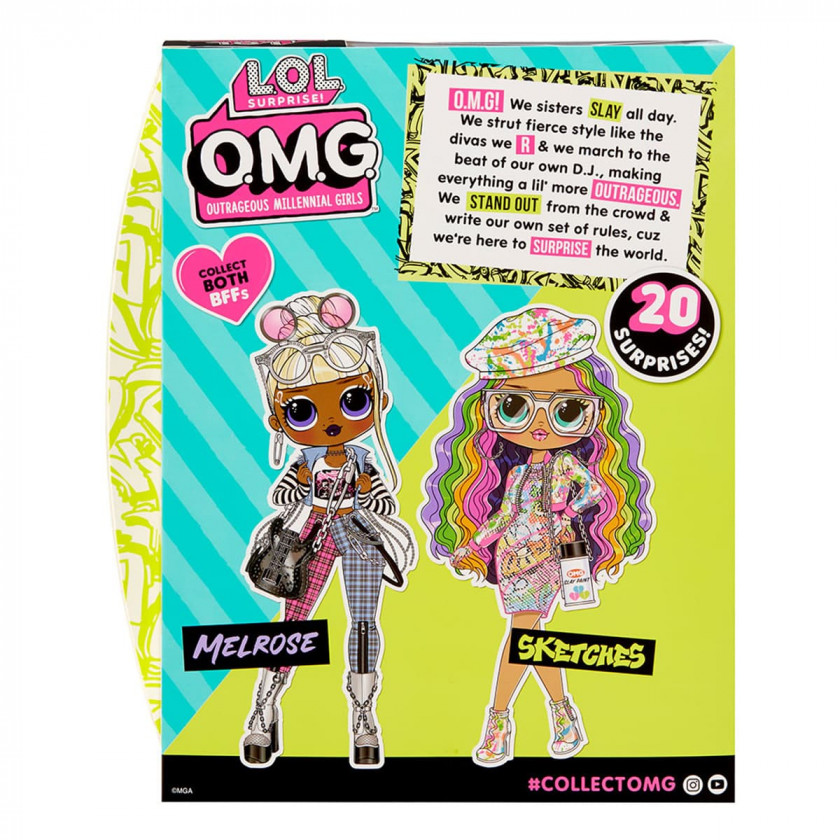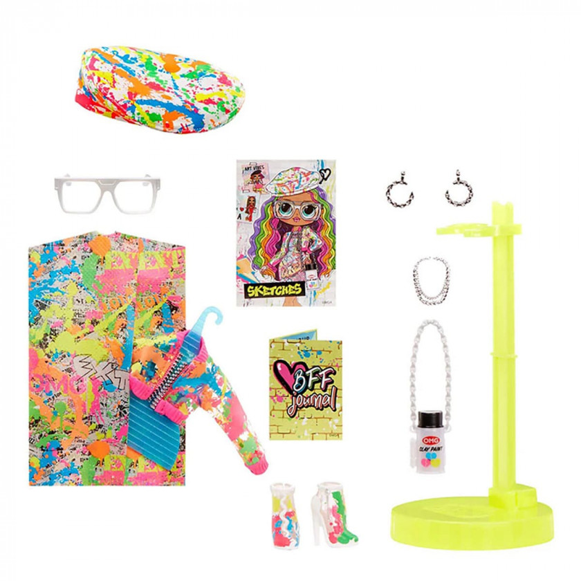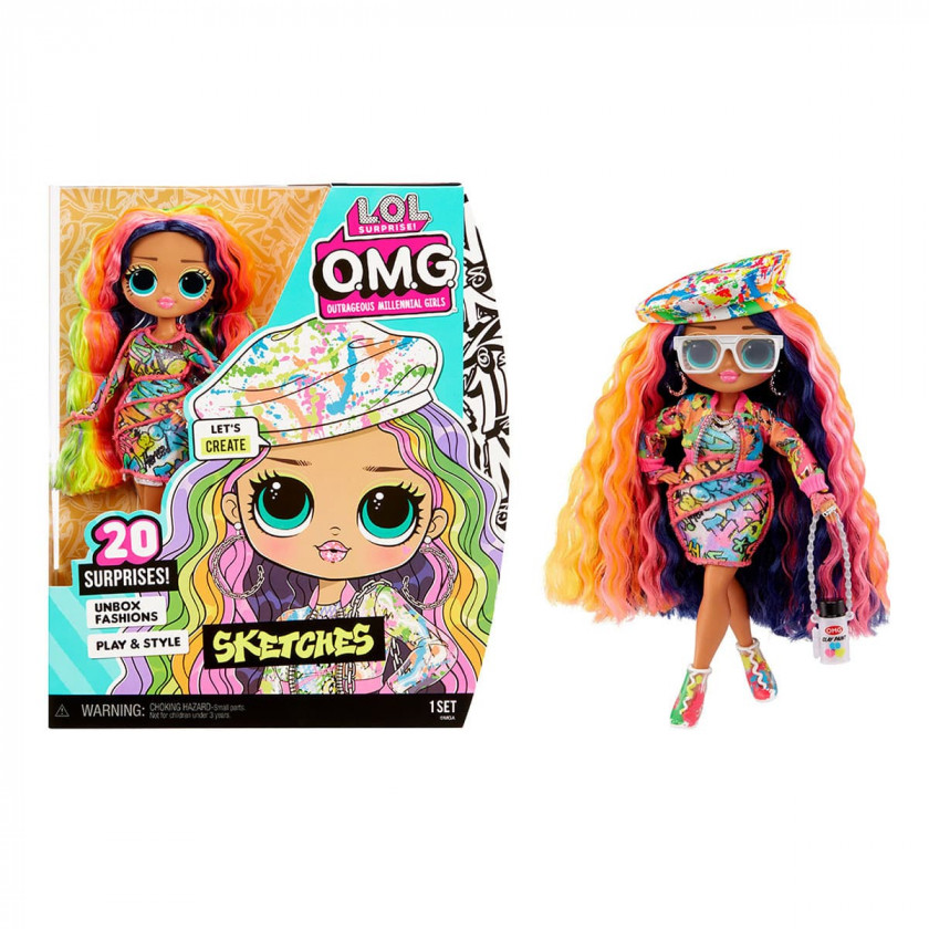 Ляльковий набір LOL Surprise OMG Core S6 Леді Скетч — неймовірно стильна фешн-красуня! Вона виділяється своїм яскравим образом та нестандартним підходом до моди! Тільки подивіться, скільки кольорів вона використовує! Які яскраві бризки! Вона справжній художник! Навіть її сумочка виглядає як балончик із фарбою. 20 сюрпризів при розпаковуванні ляльок. Лялька має шарнірні руки, що дозволяє вигадувати ще більше цікавих сценаріїв для гри. Підставка для ляльки може бути як підставкою, так і стільцем.