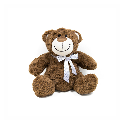 Іграшка коричневого кольору прикрашена картатим білим бантиком на шиї. Справжній джентльмен. Ротик на мордочці темного кольору вишитий нитками, а очі, виготовлені із пластику, надійно закріплені.
