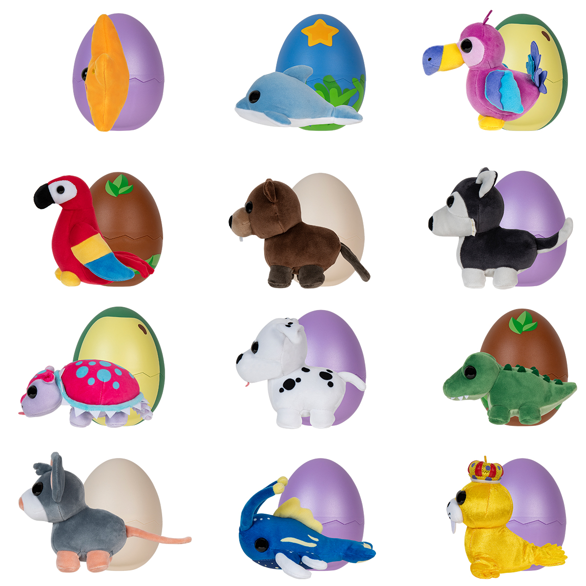 Оживіть дивовижних тваринок з популярної гри Adopt Me! Збирайте різні яйця Adopt Me, які дадуть вам підказку про героя, що Ви відкриєте. Розпакуйте та розкрийте яйце, і знайомтеся з новим м’якеньким другом! Яка тваринка Вам більше до вподоби? У цій серії Ви можете знайти далматинця, дельфіна, папугу, крокодила та багато інших цікавих тварин! Як бонус, кожна іграшка містить ексклюзивний код віртуального предмета! Ці колекційні плюшеві звірята варіюються від звичайних до легендарних та ідеально підходять для ігор, обіймів і веселих ігор. Зберіть їх усіх!