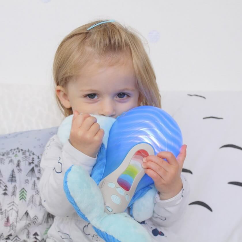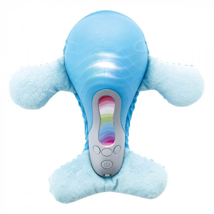 Світильник виготовлено з текстильних матеріалів з окремими пластиковими елементами. Це дозволяє дитині взяти іграшку з собою в ліжечко - вона не має твердих поверхонь, здатних завдати шкоди малюкові. Пристрій здатний відтворювати три ніжних мелодії або звуки природи в трьох варіантах на вибір батьків (для денних ігор дитини, а також для сну). Світильник ніжно підсвічує різними ефектами (5 світлових відтінків).