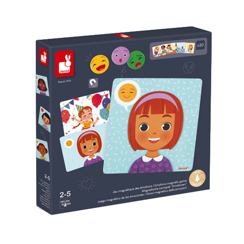 Завдання дітей у цій грі полягає в тому, щоб розпізнати емоцію за картками із різними емоційними ситуаціями. А потім правильно додати й з'єднати магнітні обличчя з емоціями на дерев'яній дошці, надіти футболку та вибрати їм правильний смайлик з емоціями. Набір містить 27 магнітів, 20 ілюстрованих карток, які показують різні емоційні ситуації та 1 магнітну дерев'яну дошку-основу. Рекомендований вік: 2+. Розмір: 32 х 4 х 32 см.
