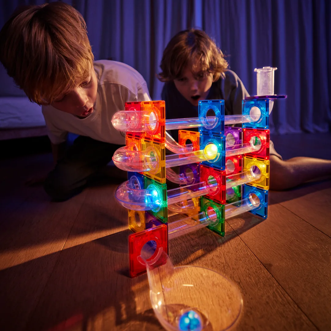 Магнітні блоки легко з’єднуються між собою, дозволяючи дітям будувати тунелі, гірки та лабіринти, які світяться в темряві завдяки LED-елементам.