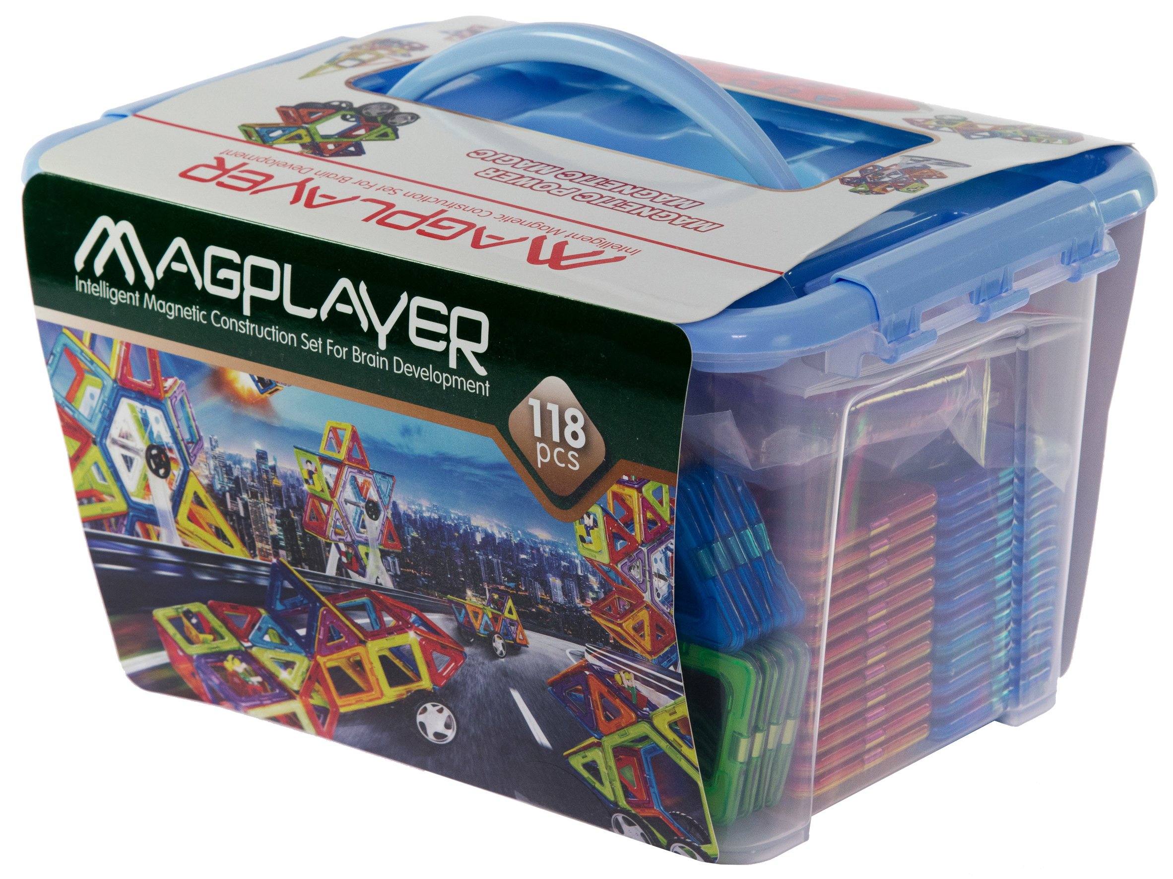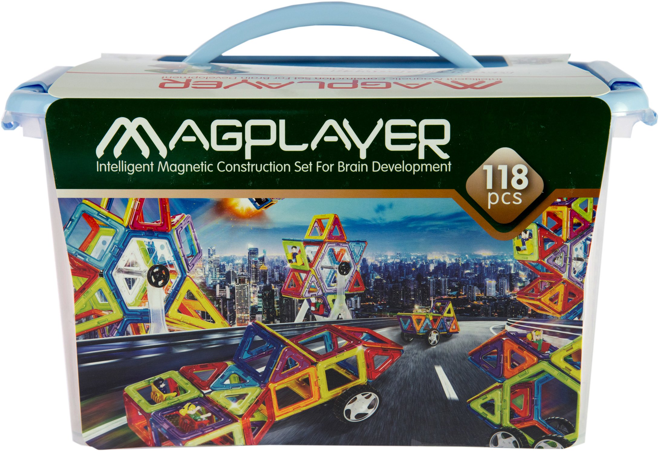 Великий набір MagPlayer складається з 118 деталей: трикутників, квадратів, шестикутників, трапецій і ромбів. Також він містить функціональні деталі: основи для вітряків або коліс огляду, двоколісні основи для автомобілів та елементи з літерами. Всі деталі оснащені магнітами, що не потребують дотримання полярності, тому дитина може кріпити елементи між собою будь-якою стороною. Пластикові елементи мають різнокольорове забарвлення, тому готові фігурки виглядають яскраво. Магнітний конструктор розвиває моторику рук та загальні розумові здібності.