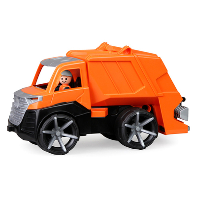 З гумовими шинами, осі з оцинкованої сталі товщиною 4 мм, кабіна водія, яку можна відкривати і грати з нею, сміттєвий бак, що замикається, і ігрова фігурка. Підходить для гри вдома та на прогулянці.