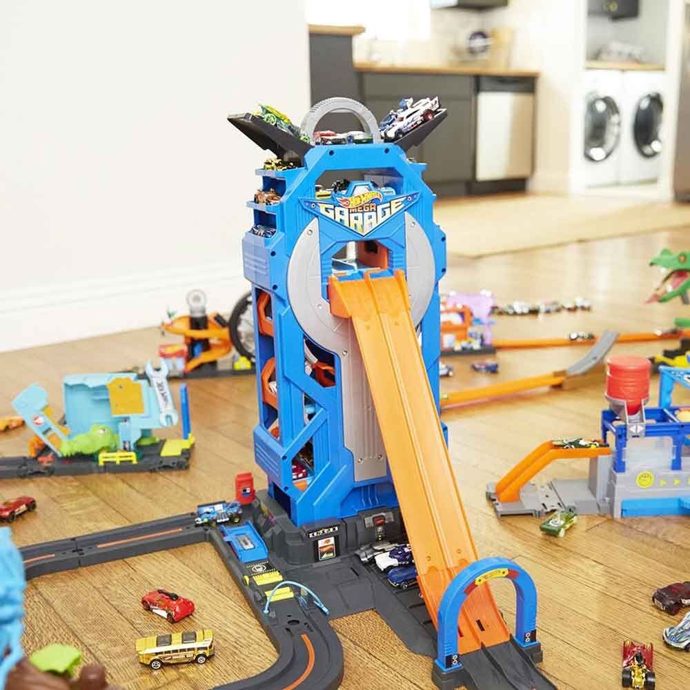 Влаштовуй неймовірні пригоди своїх машинок Hot Wheels в цьому величезному багатоповерховому гаражі. Тут є ліфт для піднімання машинок на верхній рівень, рухлива карусель-парковка, двосмуговий трек для пристрою паралельних перегонів і заправна станція, призначена для заправки машинок перед поверненням на трасу для наступних перегонів.