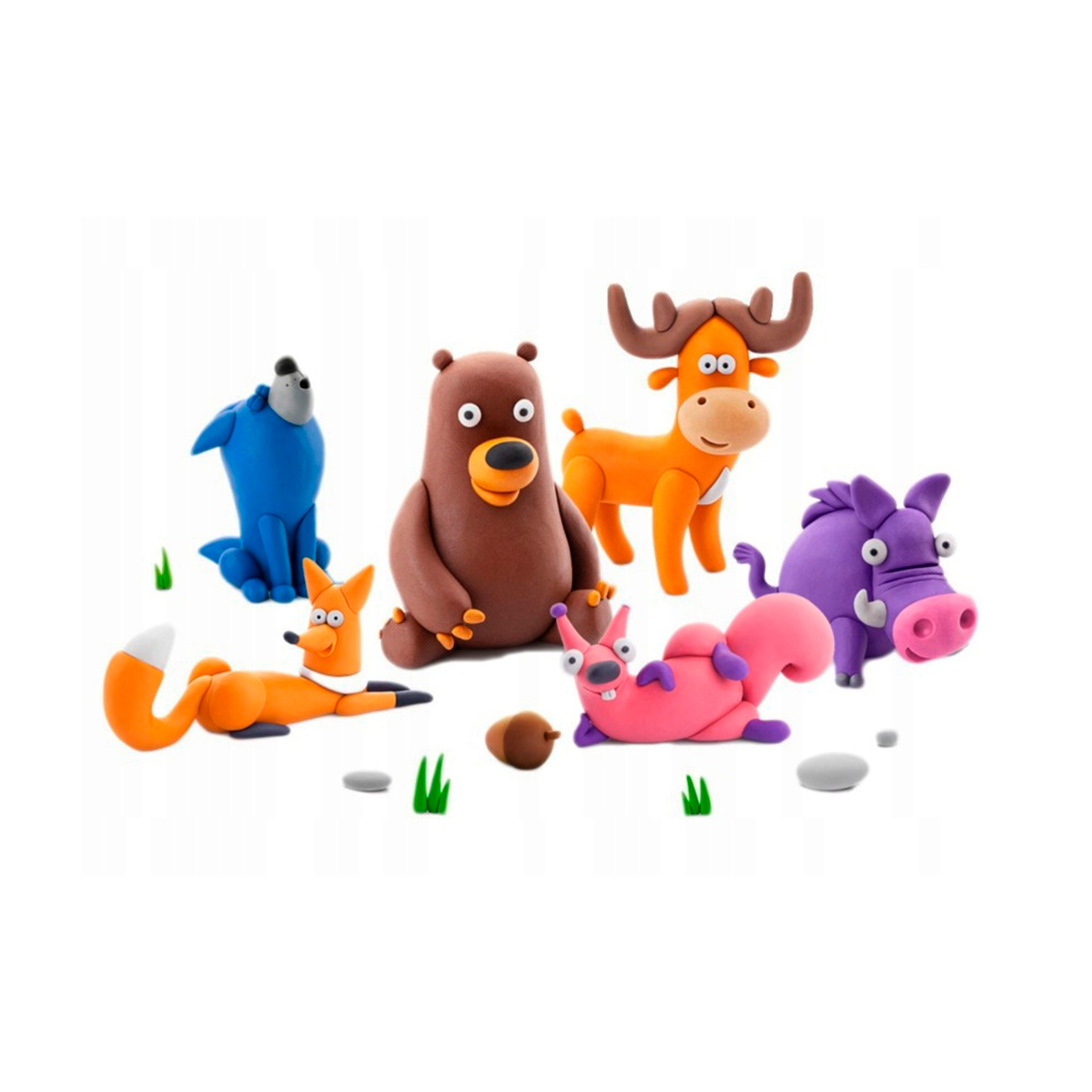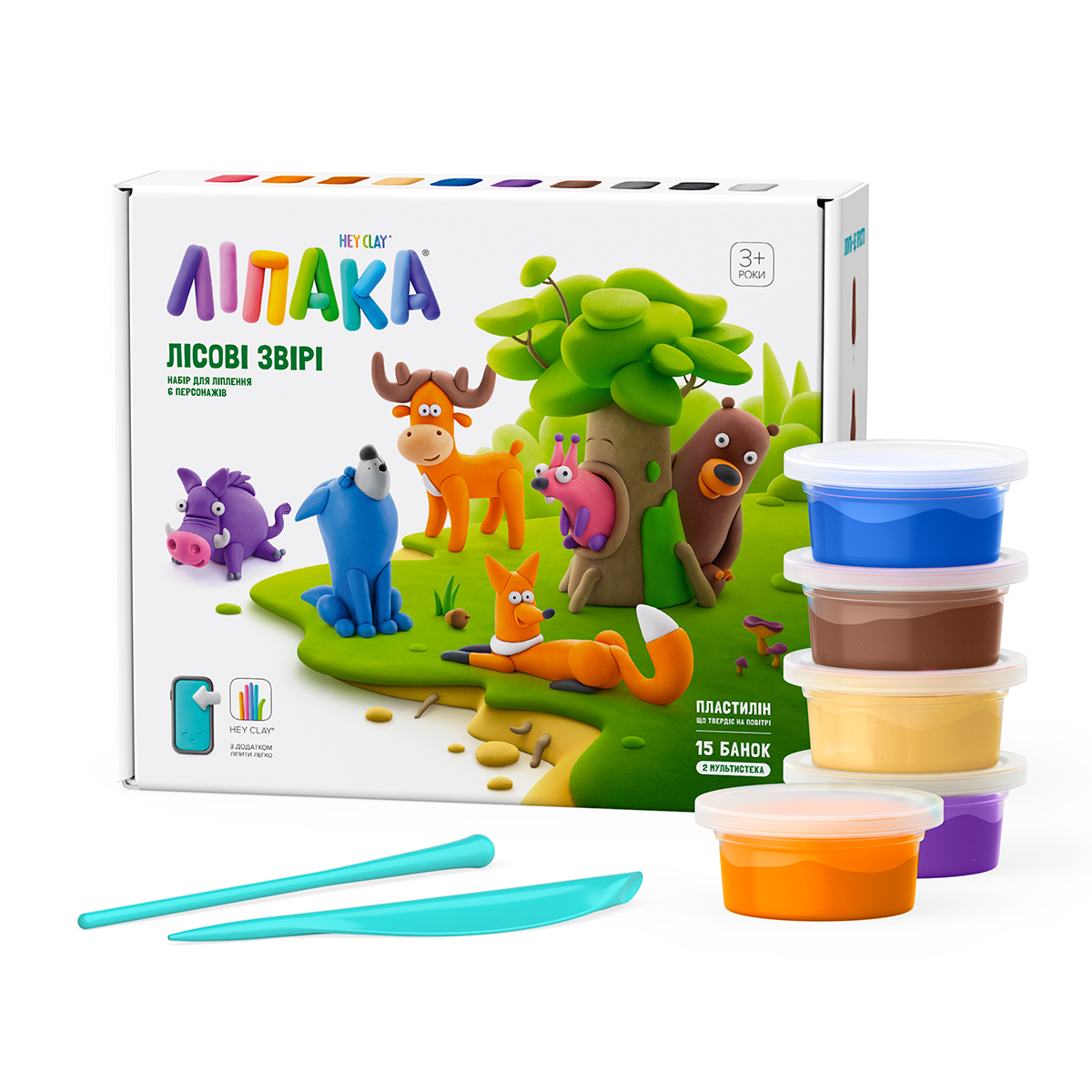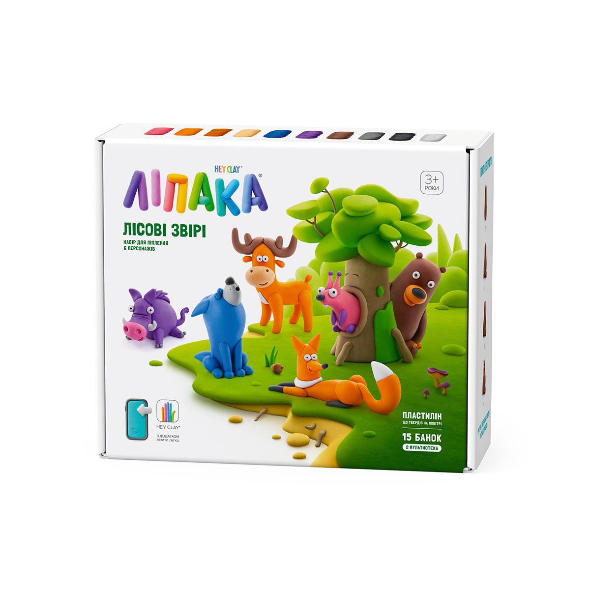 Меганабір пластиліну, що самостійно твердіє, ЛІПАКА –; ЛІСОВІ ЗВІРІ –; розважить і малюків, і дорослих. За допомогою анімаційних інструкцій в додатку HEY CLAY, Ви зможете зліпити кумедних тваринок: ведмедя, оленя, лисичку, вовка, кабанчика та білочку. Пластилін твердіє на повітрі протягом 24 годин, після чого можна гратися створеними фігурками.