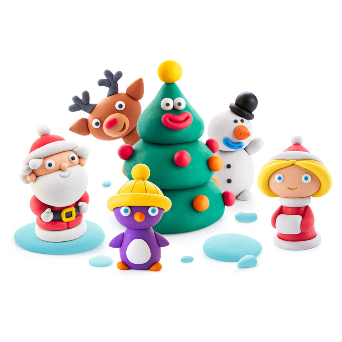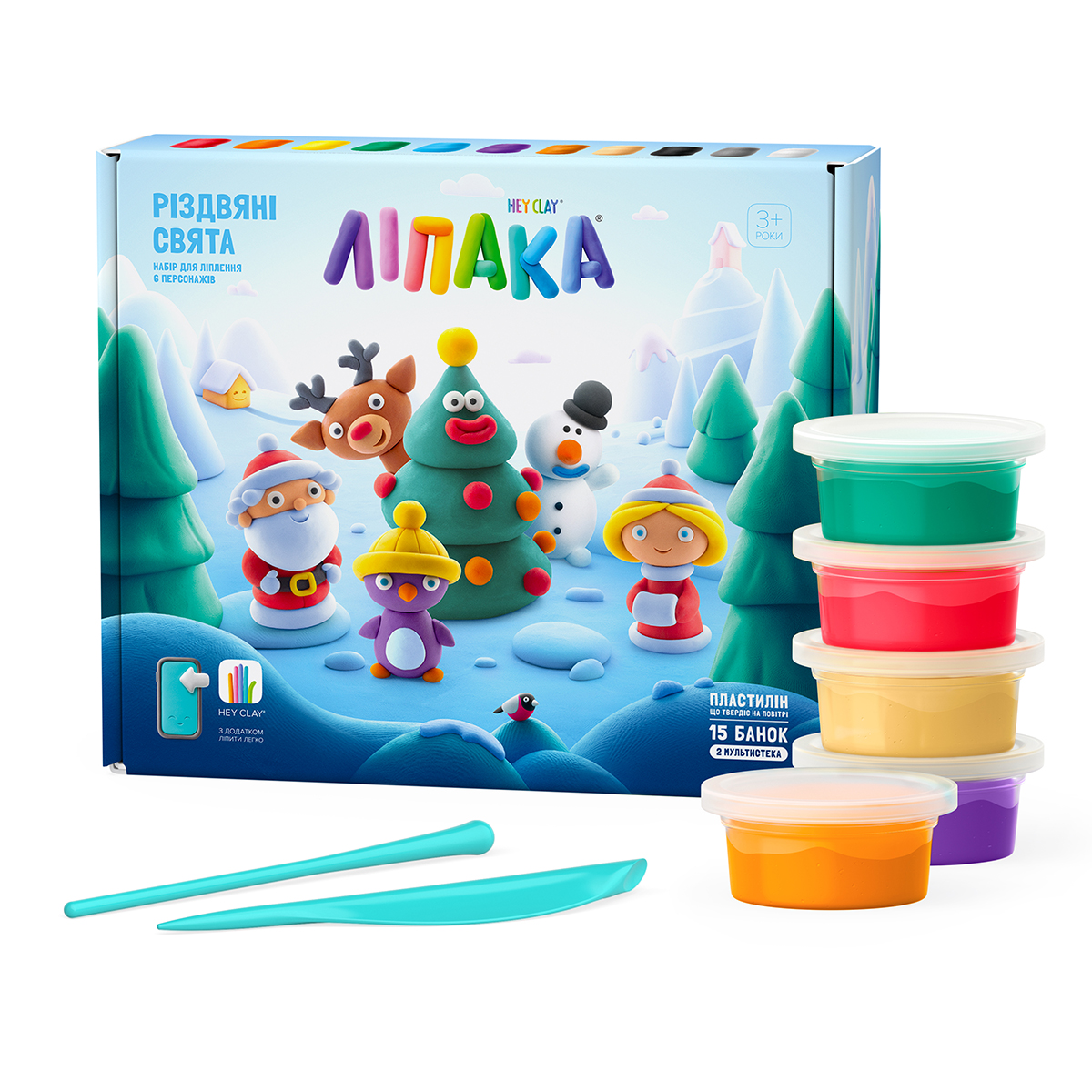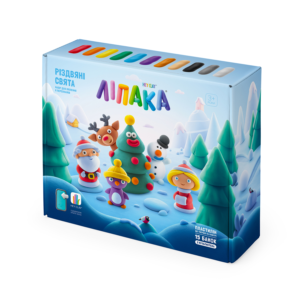 Меганабір пластиліну, що самостійно твердіє, ЛІПАКА Різдвяні свята розважить і малюків, і дорослих. За допомогою анімаційних інструкцій в додатку HEY CLAY, Ви зможете зліпити зліпити 6 унікальних персонажів: Святого Миколая, Меланку, Пінгвинятко, Ялинку, Оленя та Сніговика. Пластилін твердіє на повітрі протягом 24 годин, після чого можна гратися створеними фігурками.