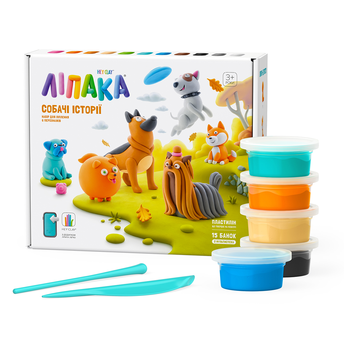 Меганабір пластиліну, що самостійно твердіє, ЛІПАКА СОБАЧІ ІСТОРІЇ розважить і малюків і дорослих. За допомогою анімаційних інструкцій в додатку HEY CLAY, Ви зможете зліпити 6 унікальних персонажів: Шпіца, Вівчарку, Йорка, Мопса, Шиба-іну та Бультер'єра. Пластилін твердіє на повітрі протягом 24 годин, після чого можна гратися створеними фігурками.