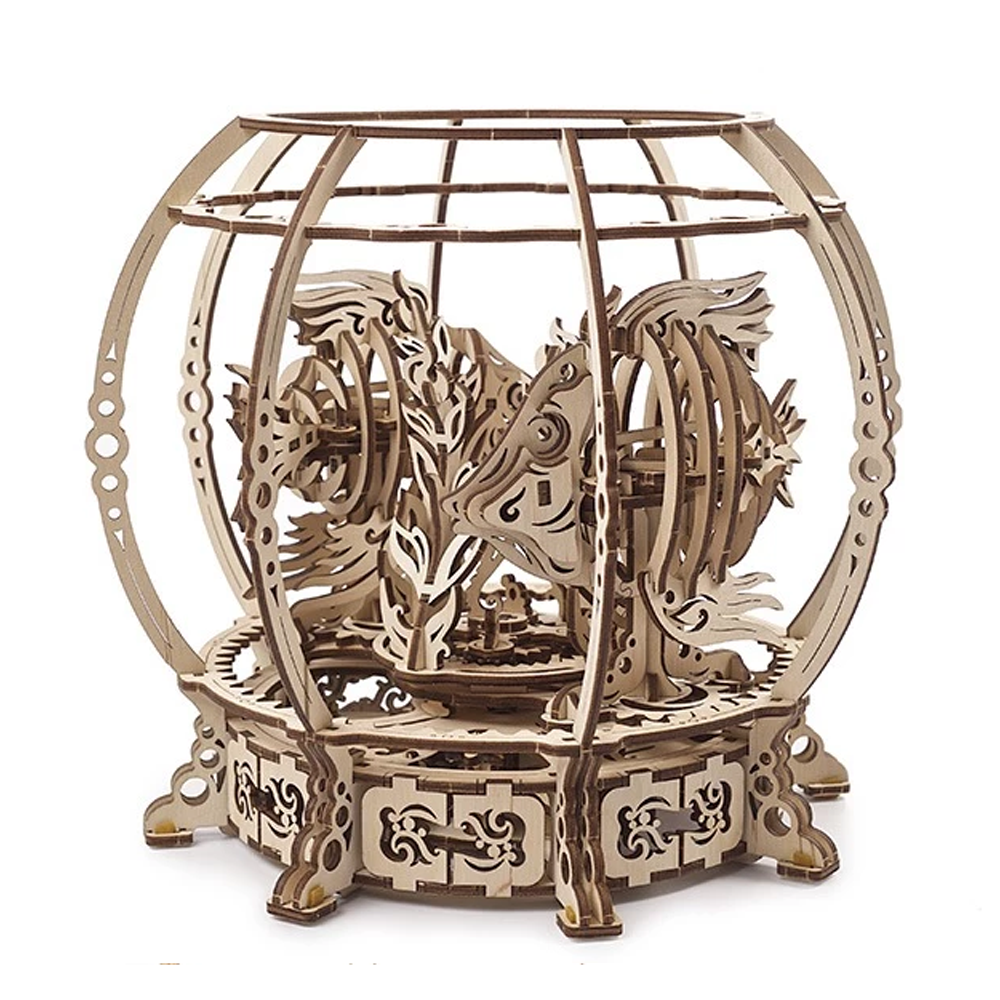 Цей акваріум, який ви можете зібрати власноруч, відрізняється не лише оригінальним дизайном, але й унікальною механічною дією. Рибки і водорості обертаються одночасно і паралельно, але з різною швидкістю і в різних напрямках, імітуючи плавний хвилеподібний рух підводних рослин і живності. Елегантні рибки мають такий вигляд, ніби вони дійсно пливуть – мотають головою і хвостом з боку в бік.