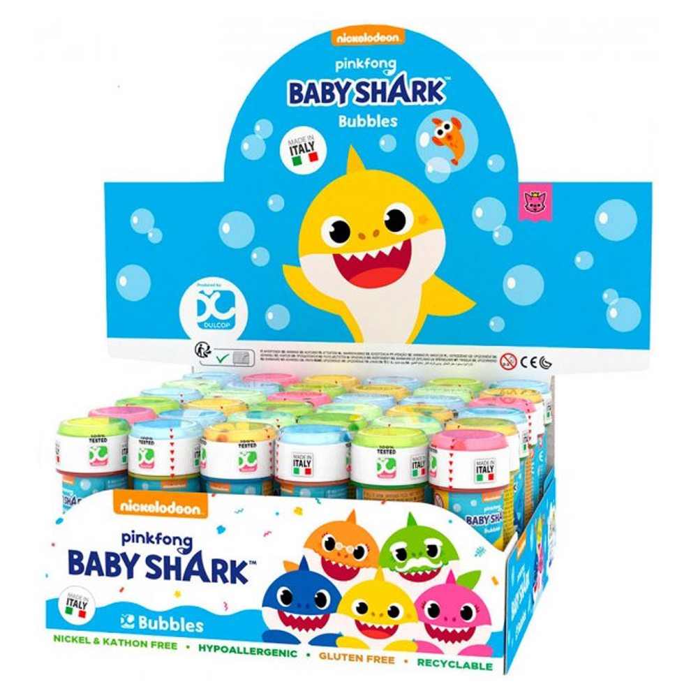 - Яскравий, барвистий дизайн пакування із зображенням улюблених героїв мультфільму «Baby Shark».