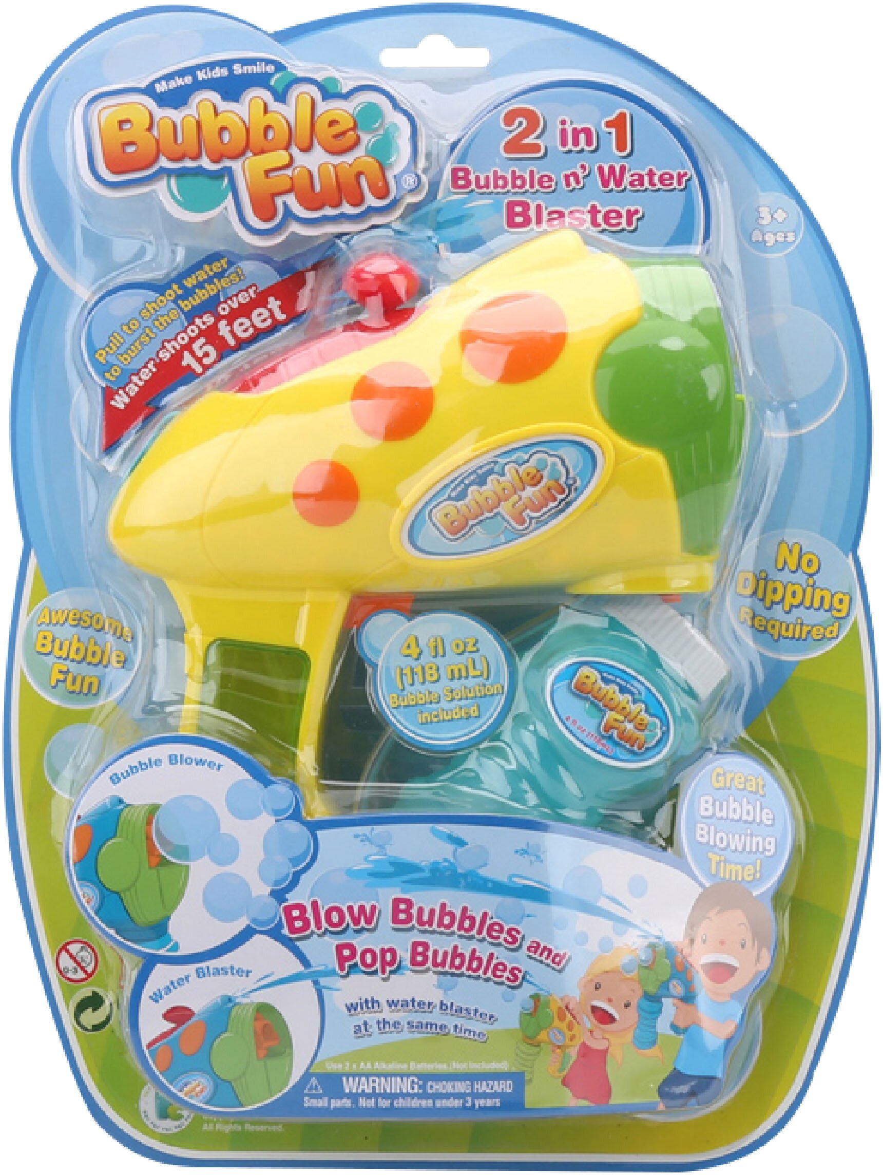 Мильні бульбашки 2 в 1 Пістолет для бульбашок і розпилювач води об'ємом 120 мл. Видуває до 2000 бульбашок за хвилину. Вимагає 2 батареї АА.