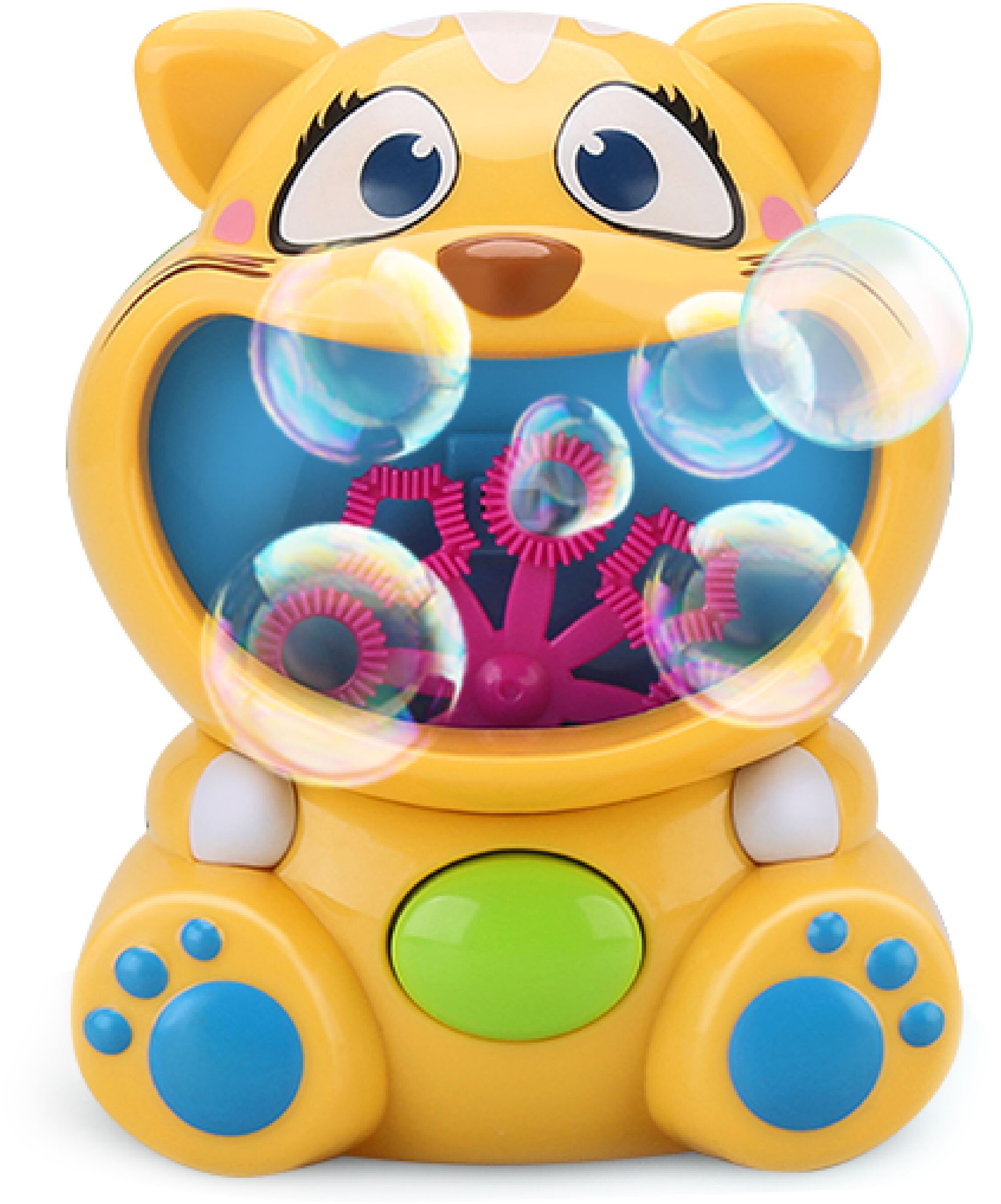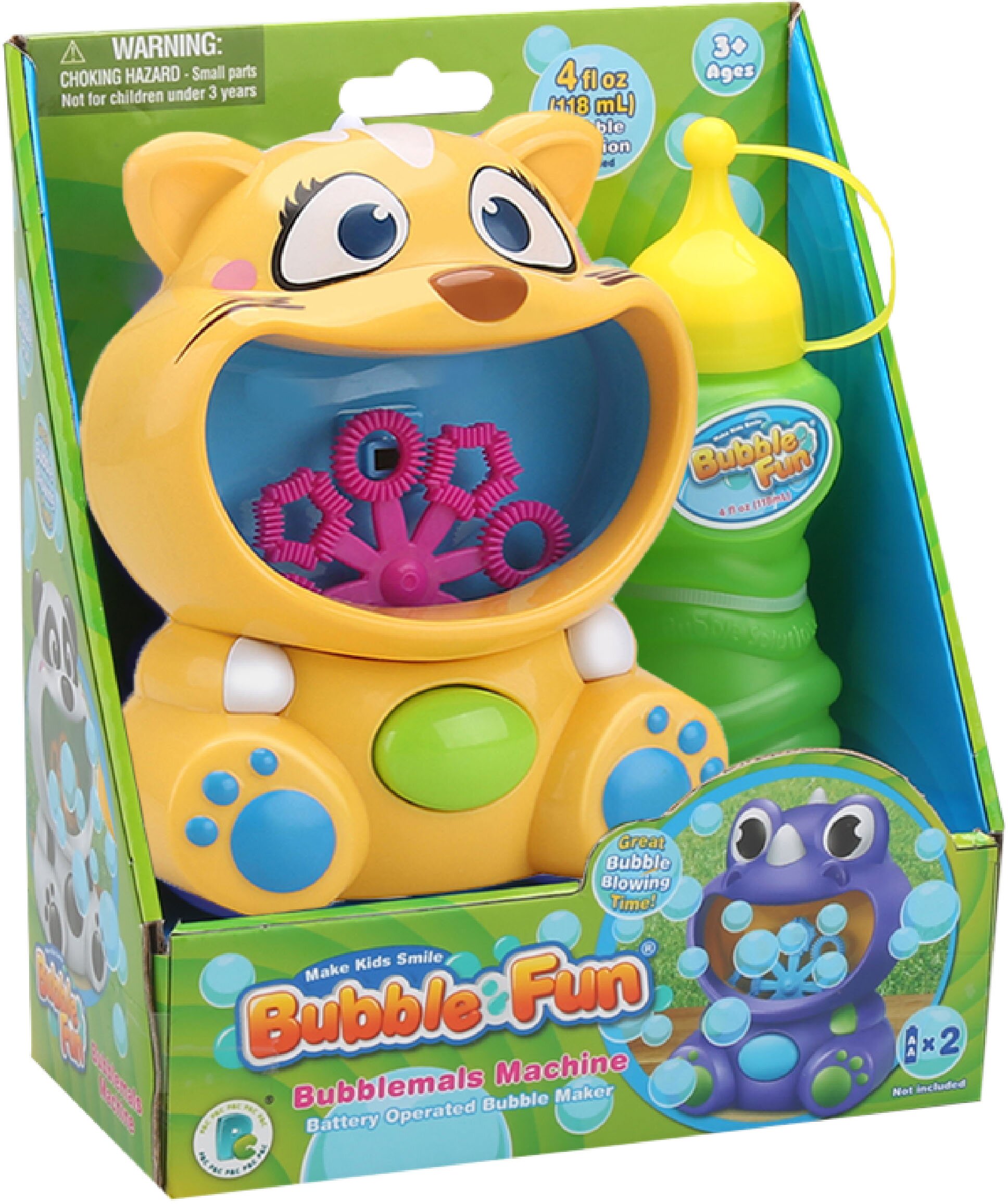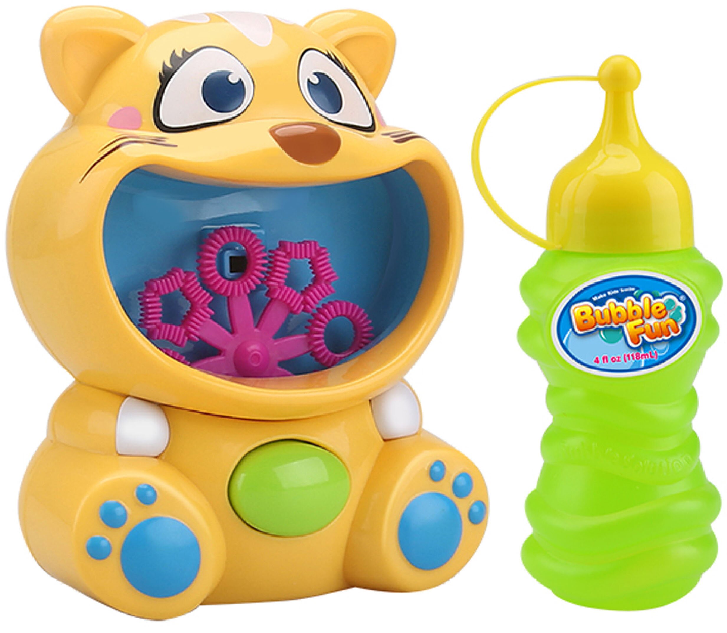 Мильні бульбашки Котик об'ємом 120 мл. Видуває до 2000 бульбашок за хвилину. Вимагає 2 батареї АА.