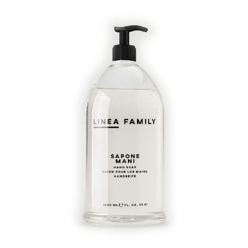 Рідке мило LINEA FAMILY ніжного складу, збагачене дермозахисними компонентами та гліцериновими екстрактами оливок і кардамону, вирощених органічним способом.