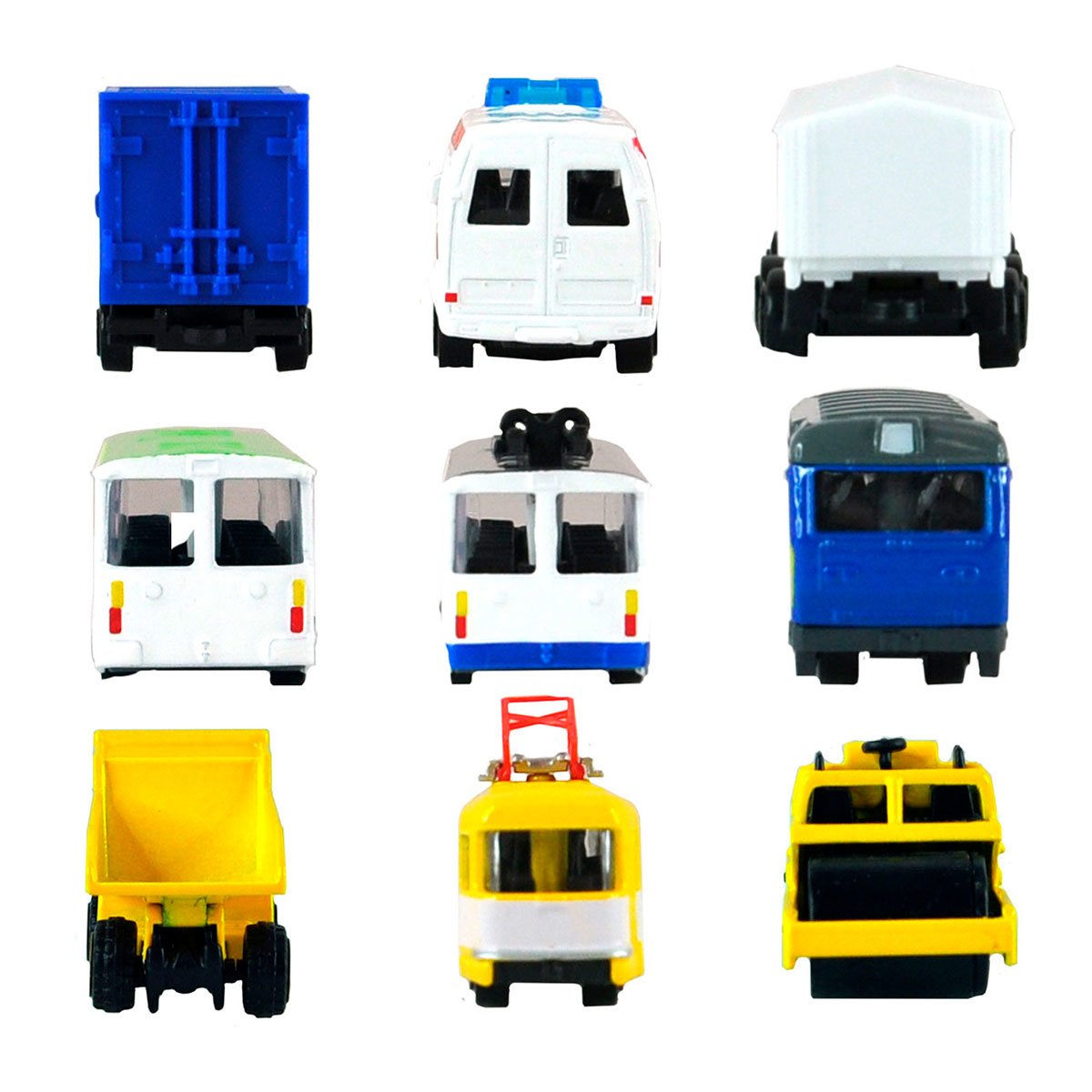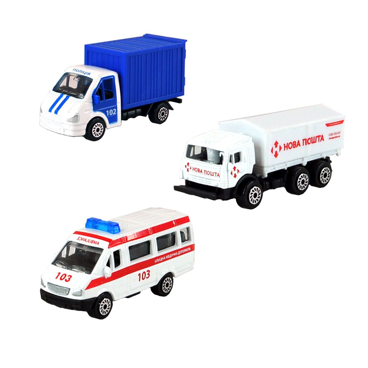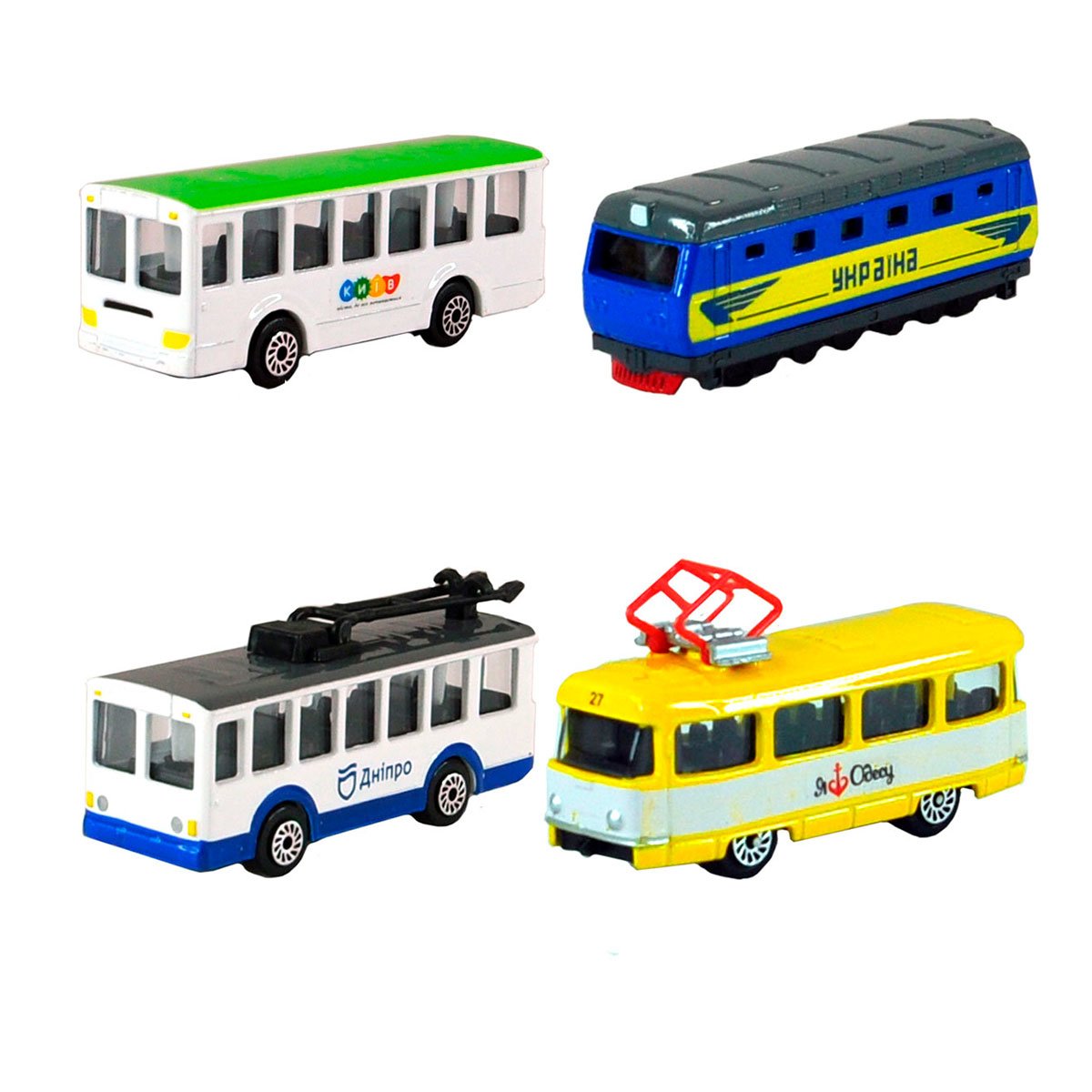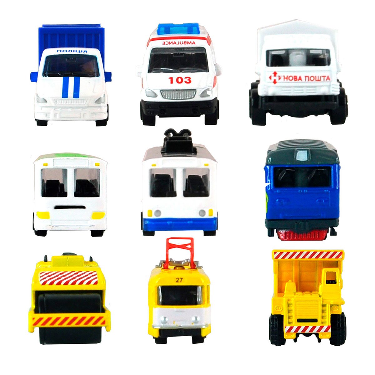 Серед іграшок: автобус Київ, тролейбус Дніпро, самоскид, каток, поїзд, трамвай Одеса, швидка допомога, фура Нова пошта, газель поліція.