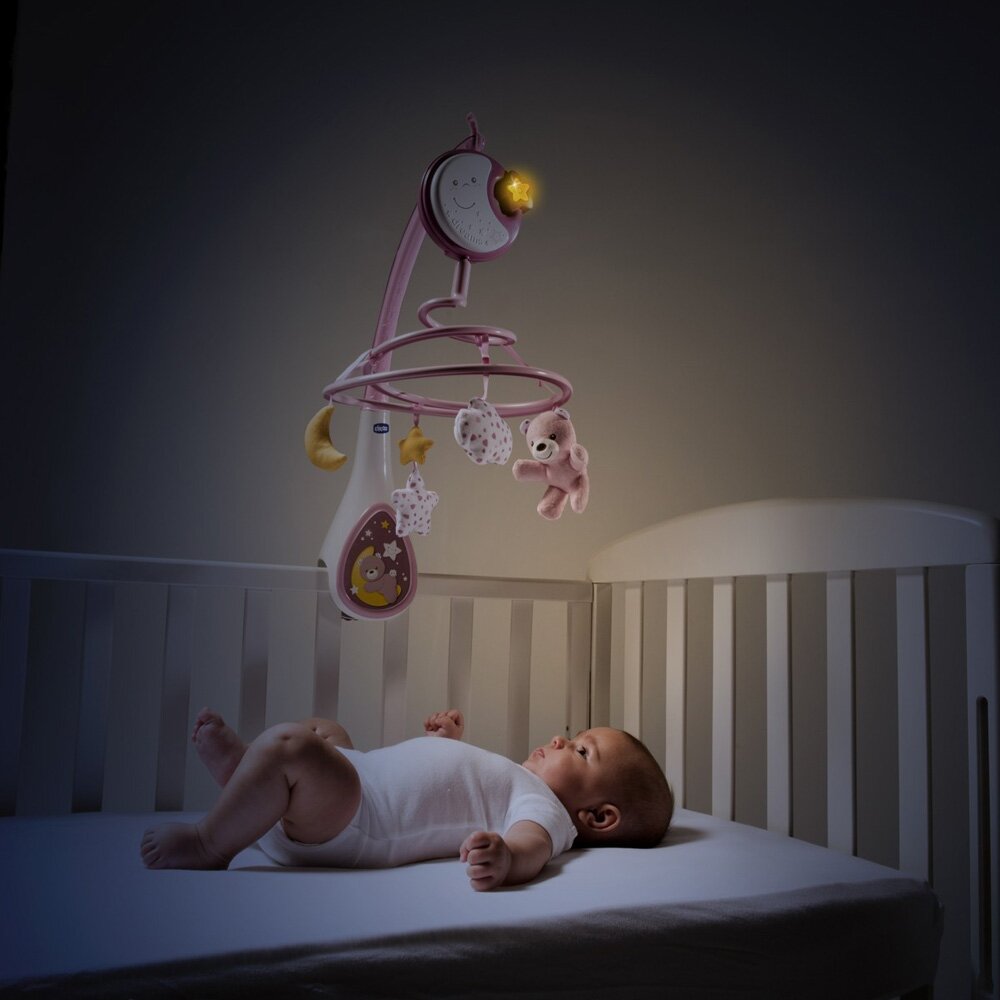 Мобайл Chicco Next2Dreams 3 в 1 в рожевому підійде як для ліжечок Next2me, так і для більшості популярних моделей інших брендів. Універсальне кріплення надійно кріпиться на бортик, його можна розташувати в манежі або колясці.