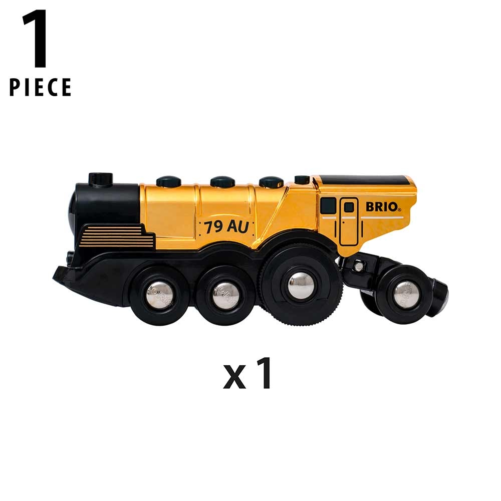 Могутній золотий локомотив для залізниці BRIO на батарейках (33630) створений спеціально для покращення вашого містечка BRIO. Скільки всього потрібного та корисного можна витворити з цим локомотивом.